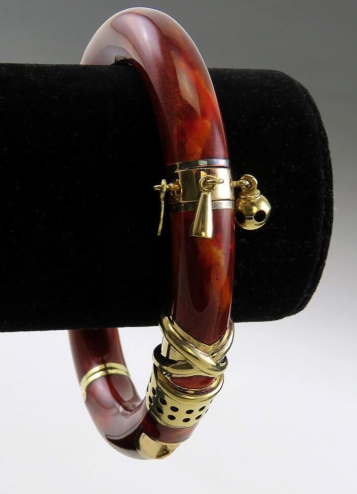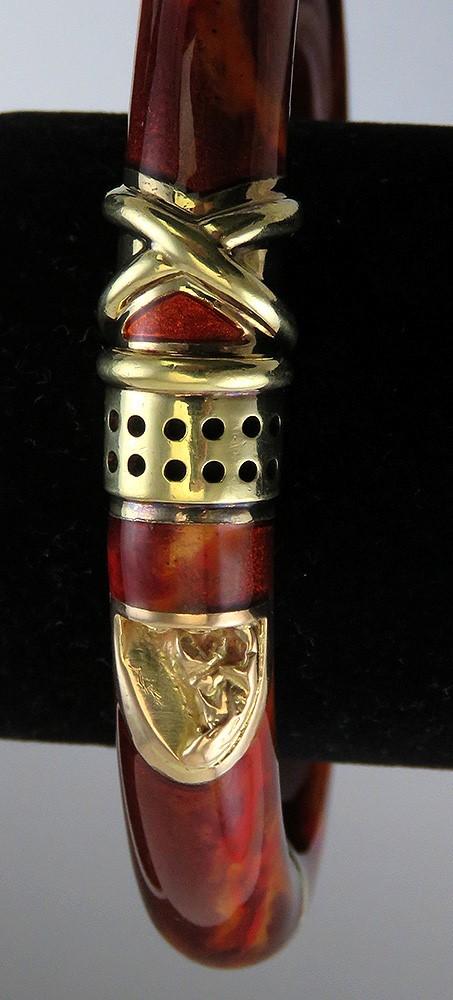 Presented is a stunning designer 18 karat yellow gold, enamel and sterling silver bangle bracelet, signed La Nouvelle Bague. The bangle is covered in rich deep red enamel, with lighter red and rust orange mottling and a subtle metallic sparkle within, giving an overall effect reminiscent of red mahogany wood or the like. Set in the bangle is a little panel of naturalistic nugget texture gold, a raised “X” design, and a little band with decorative dangles giving a charming element of movement. The hinge, clasp, joints, and decorative elements are all done in 18 karat yellow gold. The deep yellow of the gold complements the deep colorful enamel beautifully.
