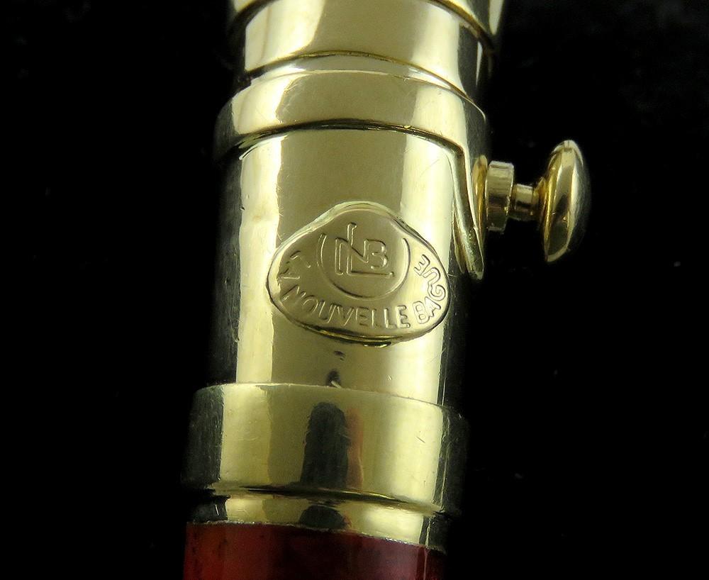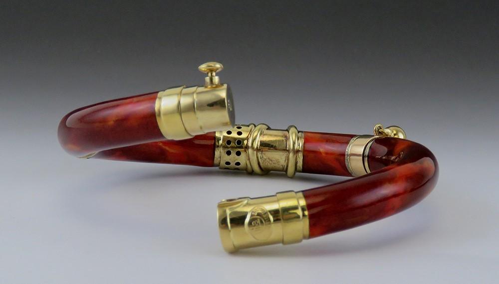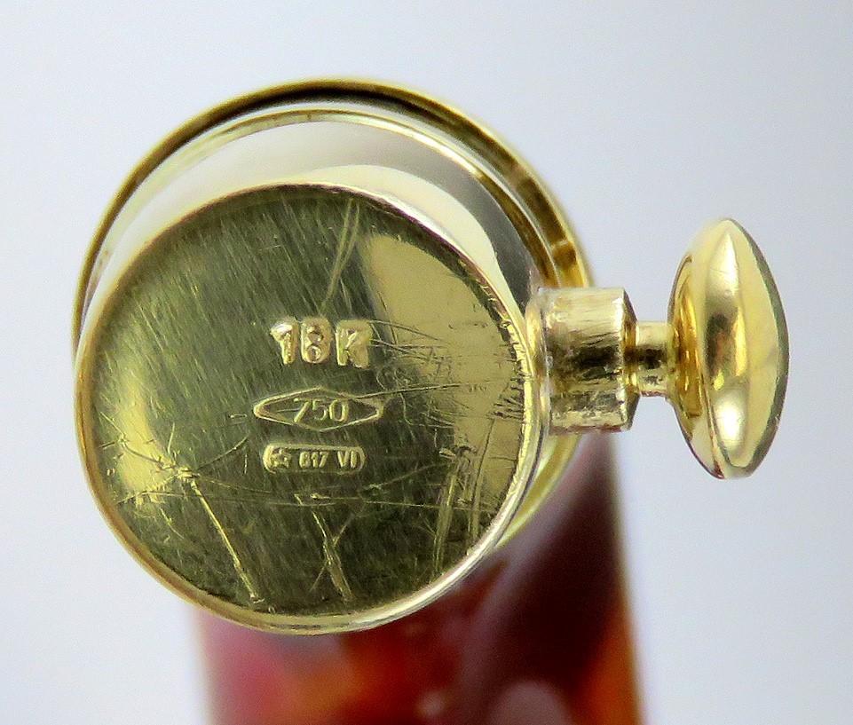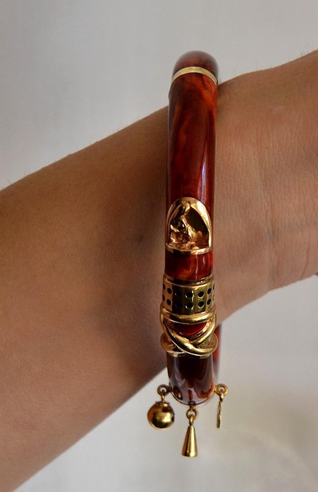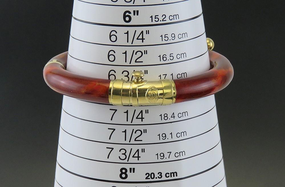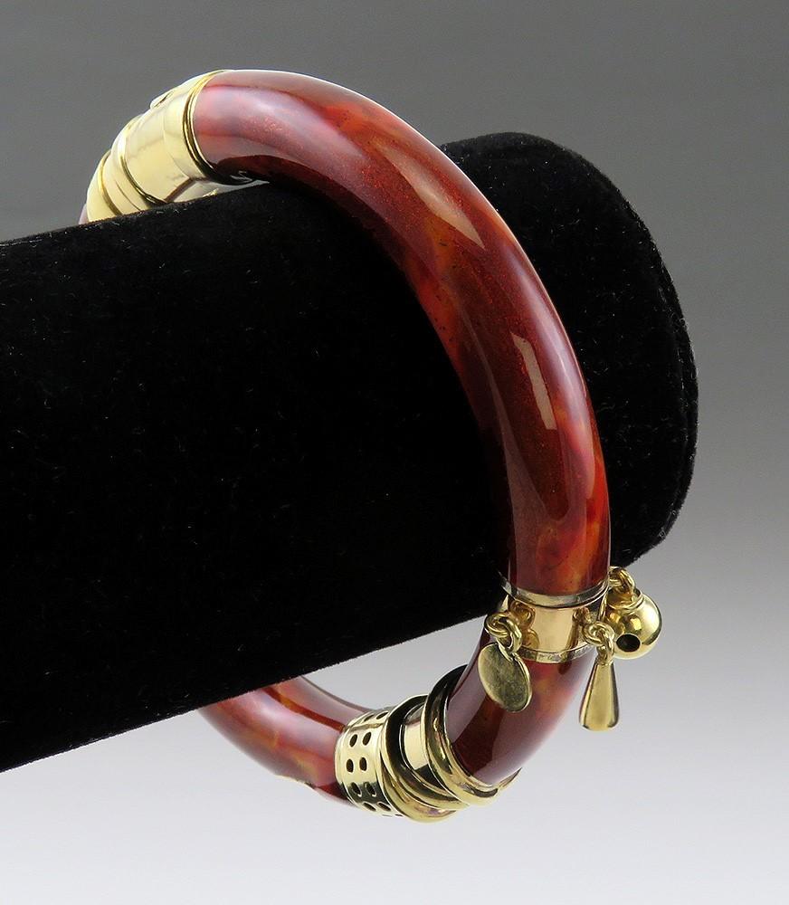 This piece is stamped on the end of the clasp with the mark for La Nouvelle Bague as well as 750 for 18 karat gold, 18k, and an Italian government registered maker's mark. The other part of the clasp, on the exterior side, has a raised applied tag reading La Nouvelle Bague. On the interior of the band of the bracelet on one side the marks 18k, 750, and the Italian mark are repeated, while on the other side is an oval spot marked 925 for sterling silver. The clasp, dangles, hinges and visible decoration are 18 karat yellow gold, nitric acid tested and guaranteed. The metal under the red enamel is sterling silver.