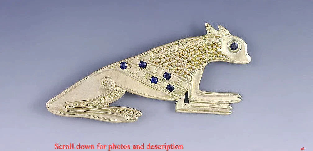 Presented is a fanciful, 14 karat yellow gold animal pin made by Diana Kim England Goldsmiths of Nantucket. This is a fairly modern piece. The animal appears to be a leopard type of cat and it is done in a stylized, almost Egyptian sort of style. The body is textured with swirls and raised beads. There are 5 sapphires set into the middle of the body and one sapphire bezel set into the face for an eye. This is a wonderful, completely hand crafted pin or brooch.