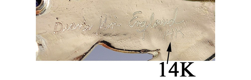 The back is marked Diana Kim England and 14K.This piece is in virtually mint condition. There are no dents, no breaks, no missing pieces, no splits and no repairs.