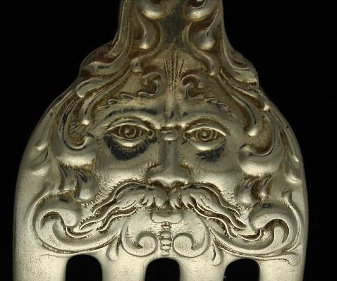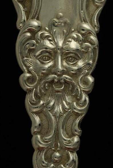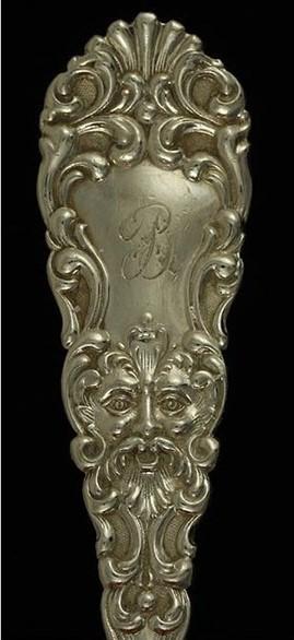 Offered in this sale is a pair of sterling forks in the Renaissance pattern by Dominick & Haff. This pattern was patented in 1894, and these pieces are old production. This is a wonderful Victorian pattern with a shell motif on the top of the handle and Northwind faces on the front of the handle and on the back at the top of the tines. These forks are in excellent condition, with nice crisp details and very little wear. Hand engraved script letter B in the reserve in the handle.