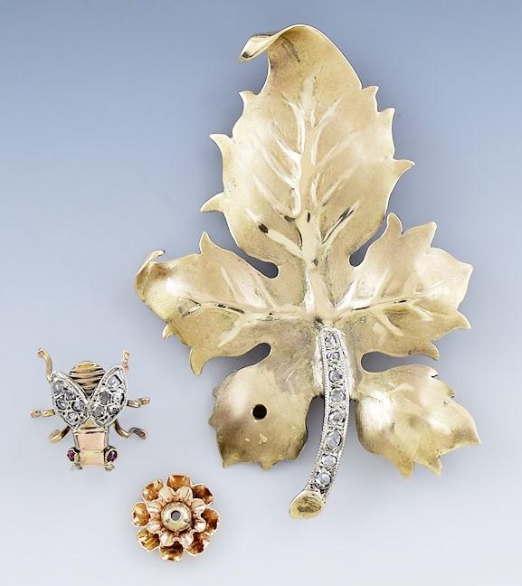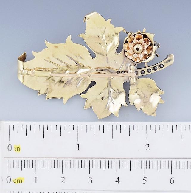 Early 1900s Artisan Austrian 14k Yellow Gold Diamond Leaf and Fly Pin Brooch