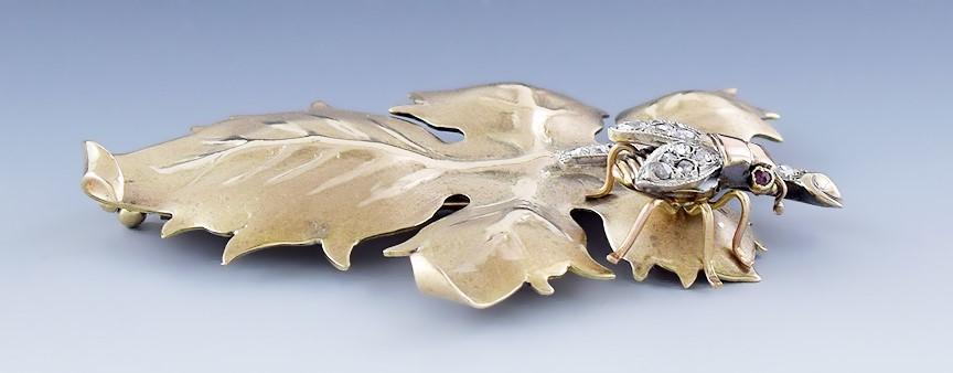 The quality of the construction on this piece is exceptional, the fly is held to the leaf with a gold nut on the back that can be unscrewed, it was made separately with a great degree of skill and attention to detail. The clasp is also a very well constructed thing, it has a little knob at the end that you pull outward, towards the tip of the leaf, to allow the pin shaft to swing outward, it is very secure.