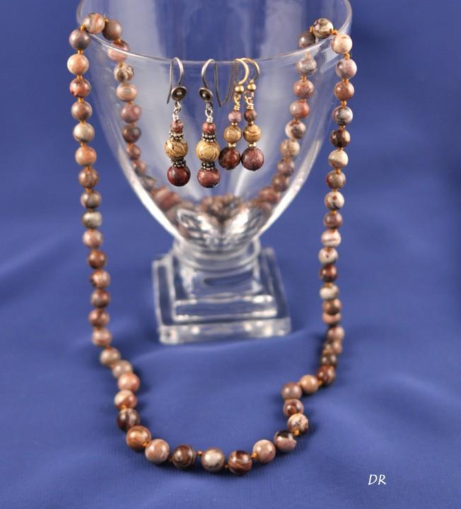 Earth-Tone Agate Bead Necklace, 2 Pairs Dangle Earrings