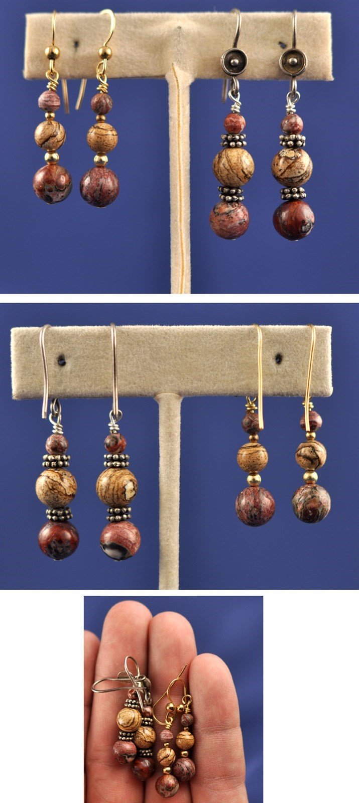 One of the pairs of earrings features sterling silver wires and beads. They are not stamped as sterling silver, but I guarantee them to be so. They are just under 1 1/4 inches long.