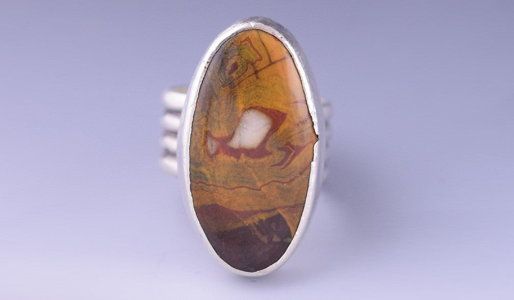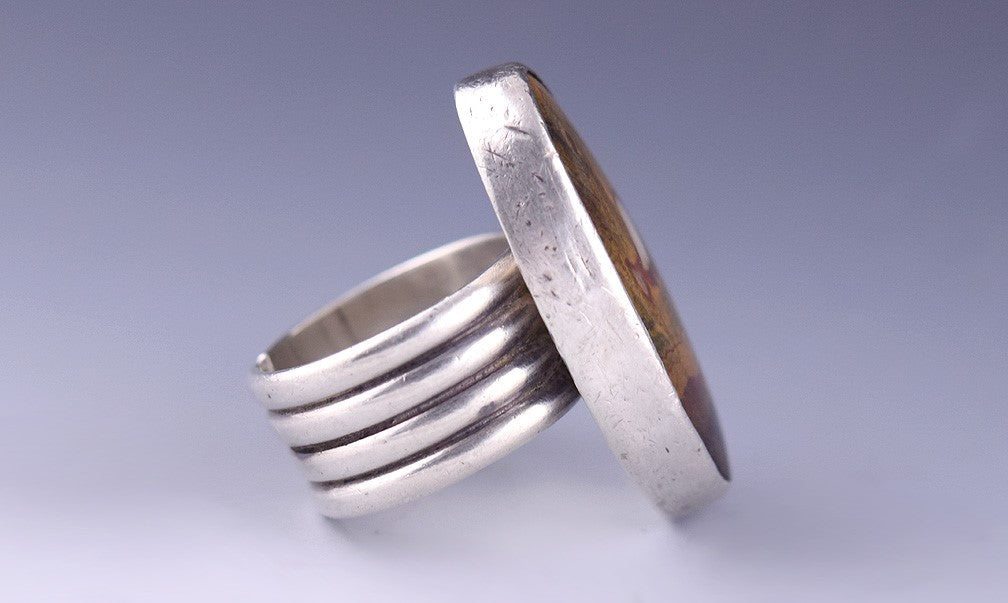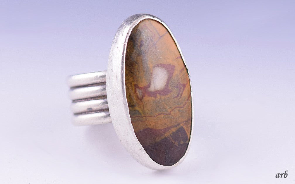 This piece features a large oval bezel-set brown, red, and chocolate-colored agate. The ring band is nice and wide, with a quadruple-band design.