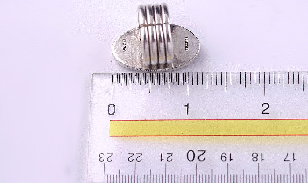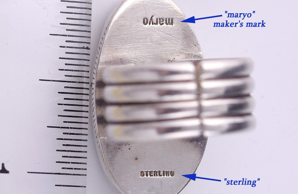 It is sterling silver, guaranteed. It is signed "Maryo" for the maker.