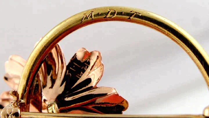 The clasp is marked 14K. There is also a maker's mark in the form of an acorn for Eckfeldt & Ackley. We have tested the pin with nitric acid and guarantee it to be 14K gold.