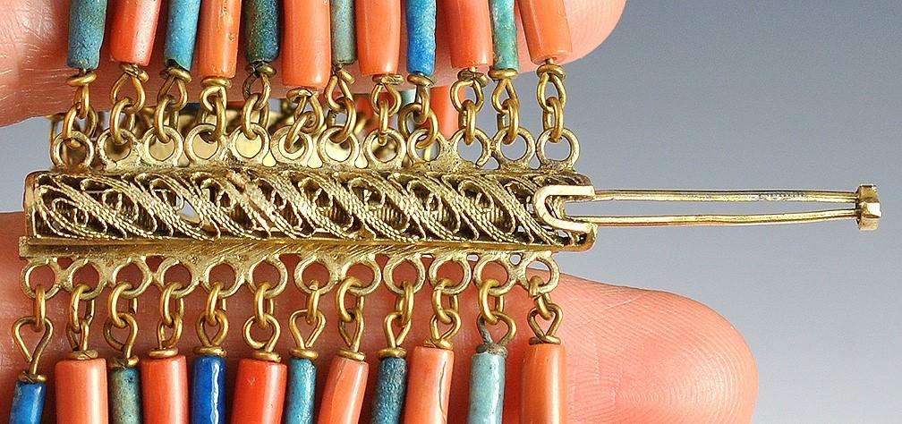 The beaded strands of the bracelet alternate between turquoise-colored faience pottery beads and rich orange-red coral beads.