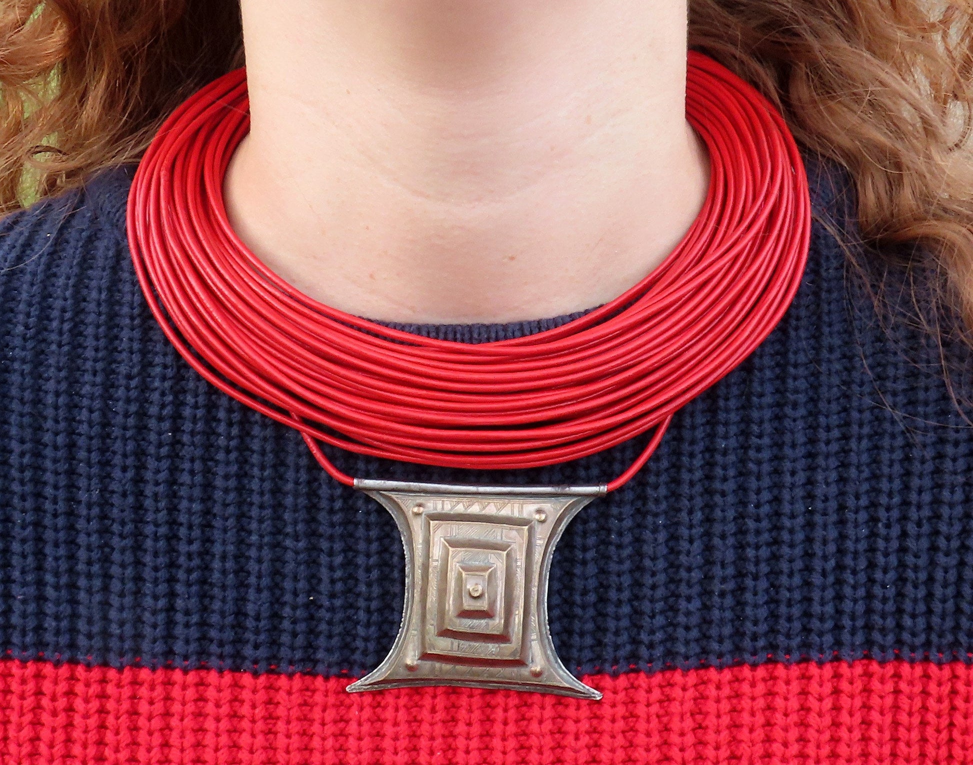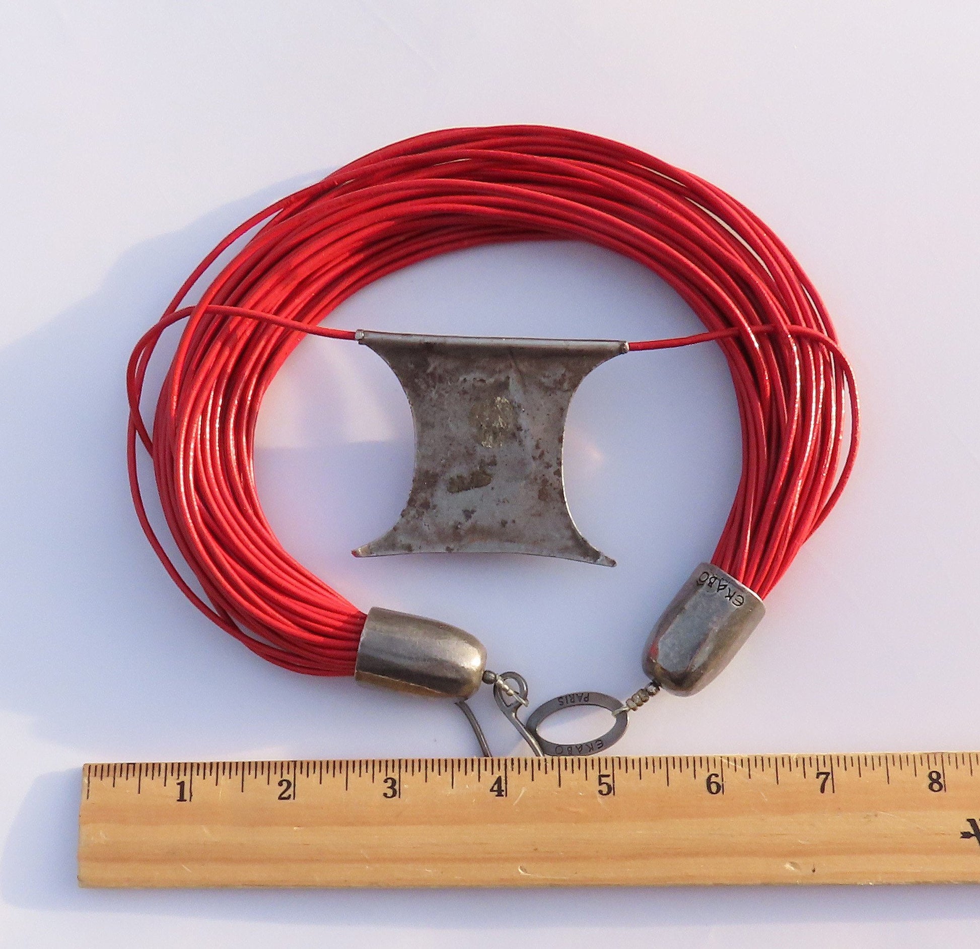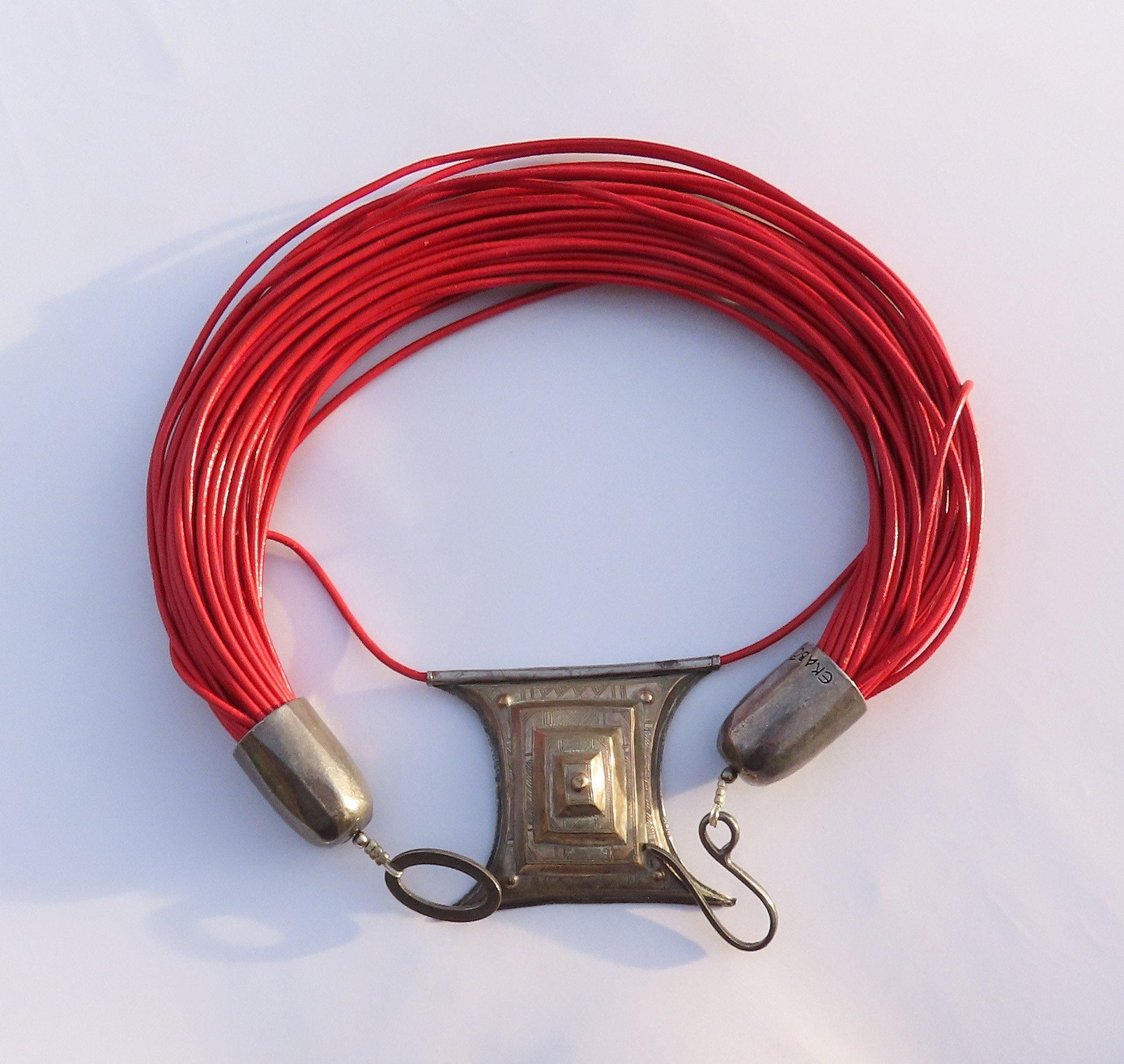 Presented is an interesting layered red leather necklace from EKABO. This piece has many layers of red leather with a large stepped pyramid pendant on the front. The necklace has a large hook closure.