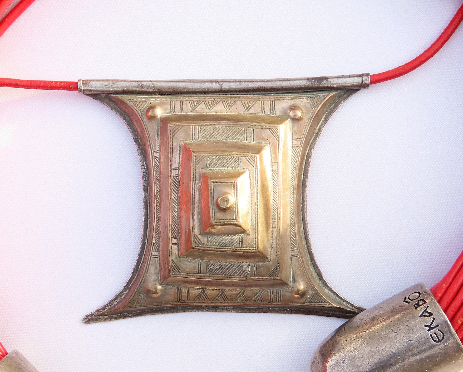 EKABO Paris African Red Leather Layered Necklace Pyramid Pendant 16 Inches