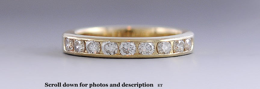 Presented is an elegant diamond 14K gold anniversary band. The ring is channel set with 9 gorgeous modern brilliant cut diamonds. Each stone is approximately 6 points each for a total diamond weight of about 1/2 carat. The stones are mostly VS quality, with a few SI-1 at the worst, and H color. This ring was made in the past 30 years.
