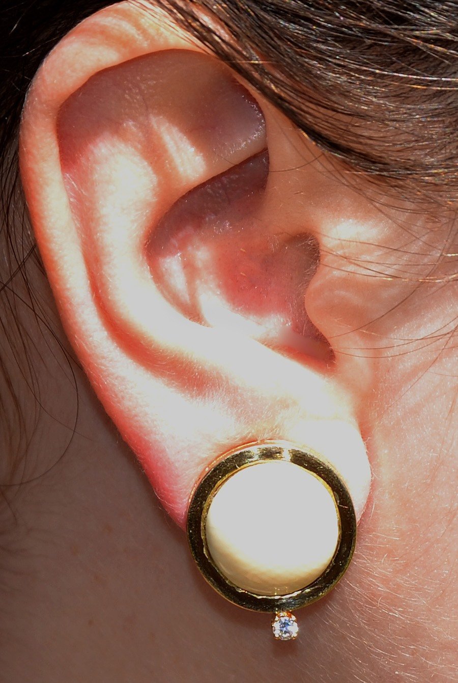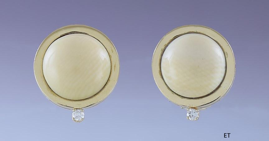 elegant form, a carved white dome in a gold setting, with a modern brilliant cut