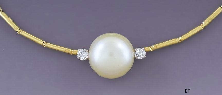 Presented is a gorgeous 18 karat yellow gold, pearl and diamond necklace. The focal point of the necklace is a beautiful mabe pearl measuring about 13.5 millimeters in diameter, flanked on either side by a modern brilliant cut diamond, prong set in white gold. The diamonds are exceptional quality stones of VS-VVS clarity and G/H color. One of the diamonds measures about 3.4 millimeters in diameter, while the other is about 3.3 millimeters in diameter—so about 10-12 points each in weight. The chain of the necklace is made up of cylindrical links, which have a nice feeling of weight and quality to them. The clasp is a bayonet style, which is quite secure.
