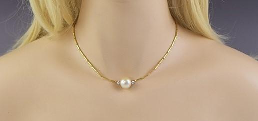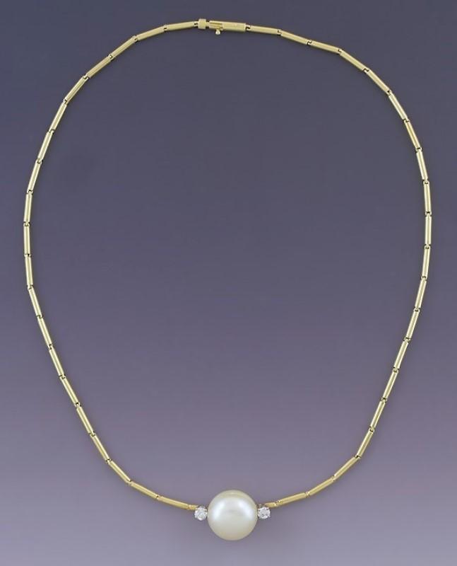 This necklace is in excellent condition. The diamonds and pearl are well set, with no chips or damages. The clasp works well.