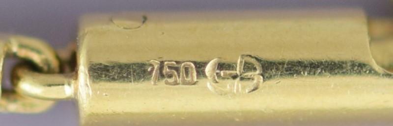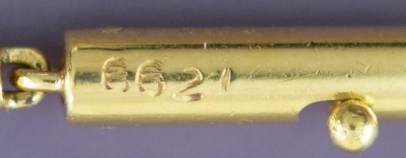 The necklace is stamped and guaranteed 750 for 18 karat gold, as well as a maker's mark of GB and a product or serial number of 6621.