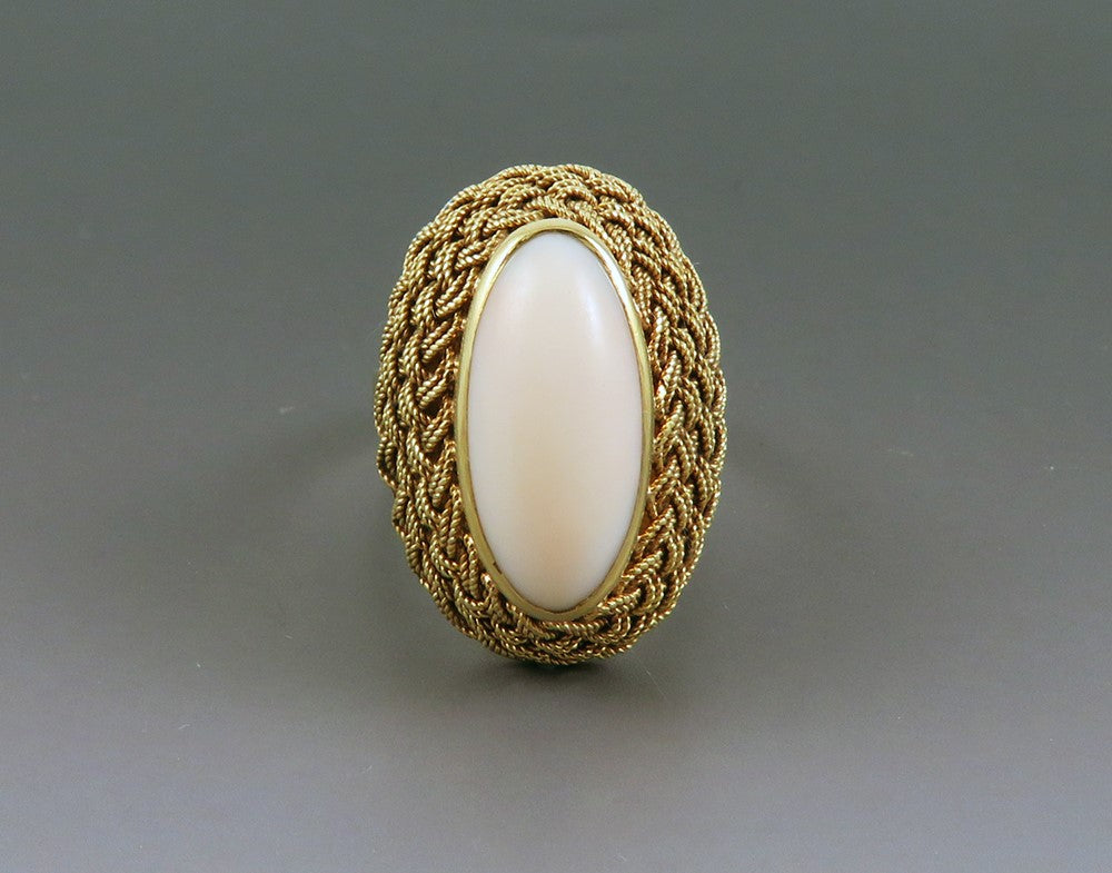 Elegant 18k Yellow Gold Italian Angelskin Coral Oval Ring w Weave Design