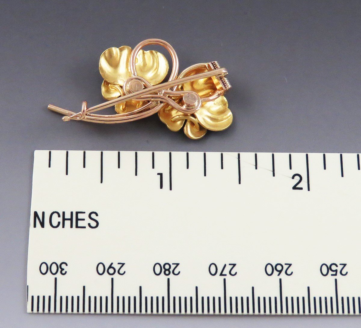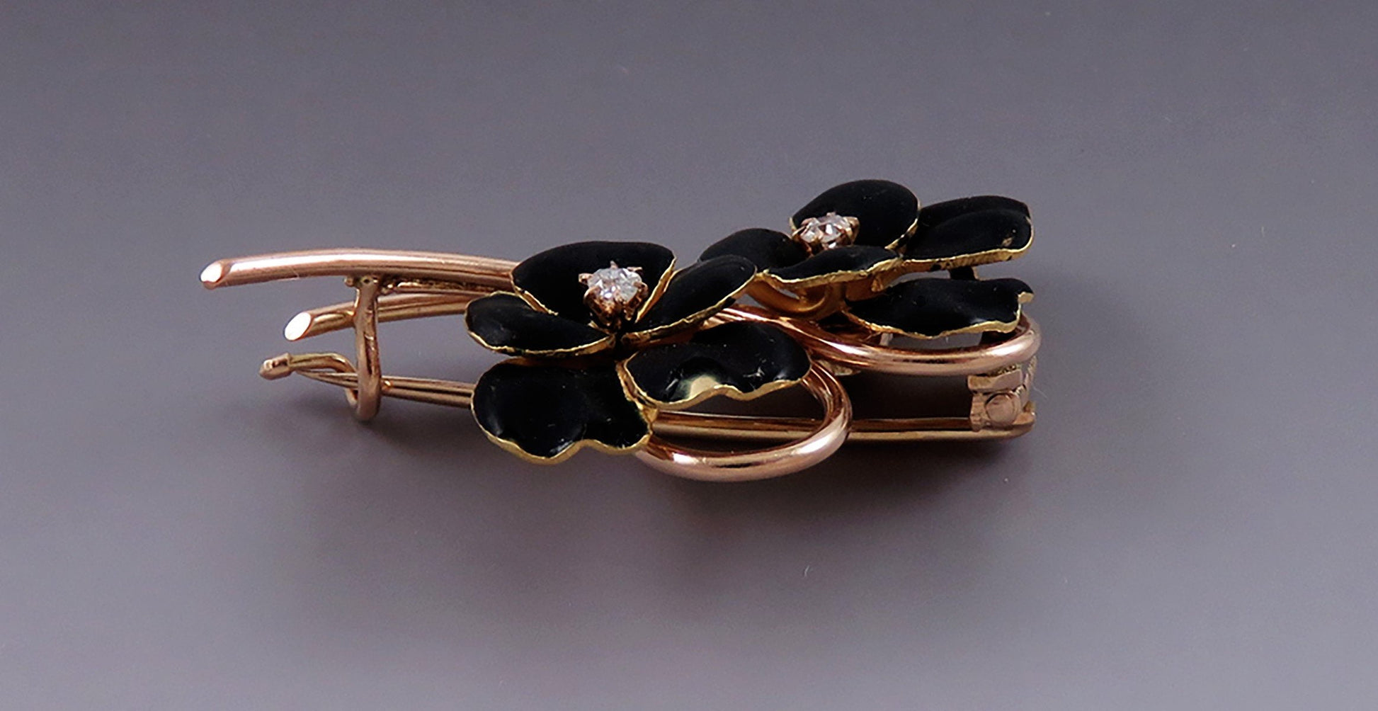 This piece is in great overall condition, particularly for its age. There is a chip to the black enamel on one of the petals, a very small chip to the petal just beneath/to the right of that petal, and two near-indistinguishable flakes in the black enamel of one petal on the other flower. The clasp is working well and closes securely.