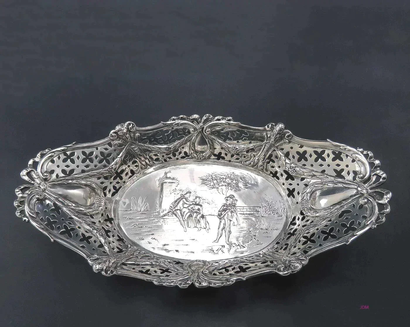 Presented is a lovely German silver pierced basket. This piece dates to the late 1800s or early 1900s and is likely the work of Storck & Sinsheimer. The dish features a charming genre scene in the center, depicting a musician playing for a courting couple. The sides of the basket are done in a pierced quatrefoil design, with applied decoration in the form of floral swags, garlands, and ram's head masks. The piece is very well made and the decoration is all very nicely detailed.
