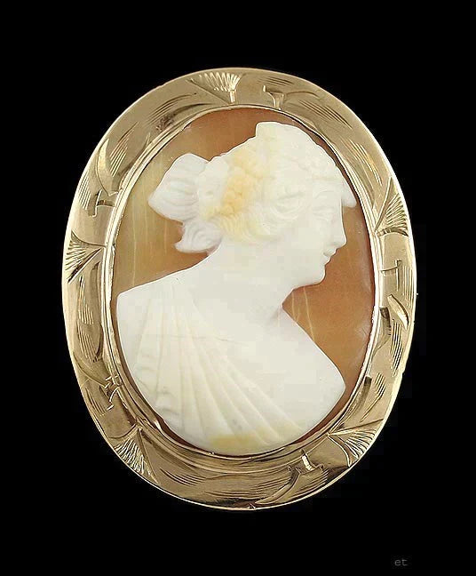 Presented is a nice 10K gold carved shell cameo pin. The cameo is well carved to depict a lovely young woman in classical attire with clusters of grapes and leaves in her hair. The cameo is bezel set in a 10K gold mounting with elegant engraving around the sides. The cameo was likely carved in Italy, while the gold setting was undoubtedly added in America. Made in the first half of the 1900s.