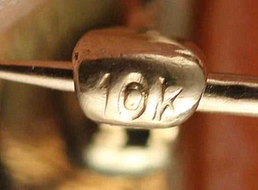 The pin is marked 10K on the clasp. We have tested it with nitric acid and guarantee it to be 10K gold.