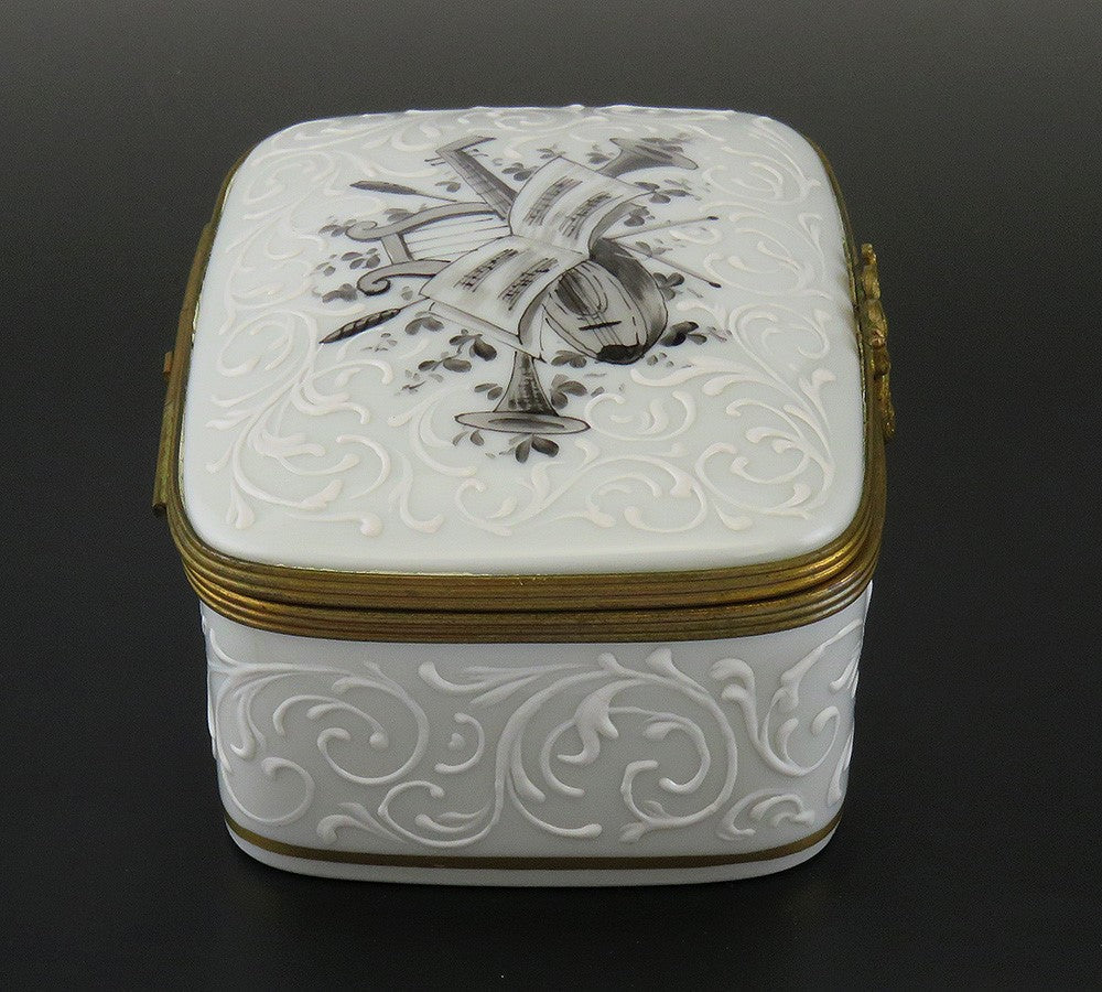 Presented is a charming little vintage French porcelain box, dating to around the 1920s-1950s. The box is white porcelain, with raised white enamel and black under-glaze decoration. The lid features a design of musical instruments and sheet music, in a detailed style, while the sides have floral decoration. The box has gilt brass hinges and fittings, with a ribbon design to the thumbpiece.