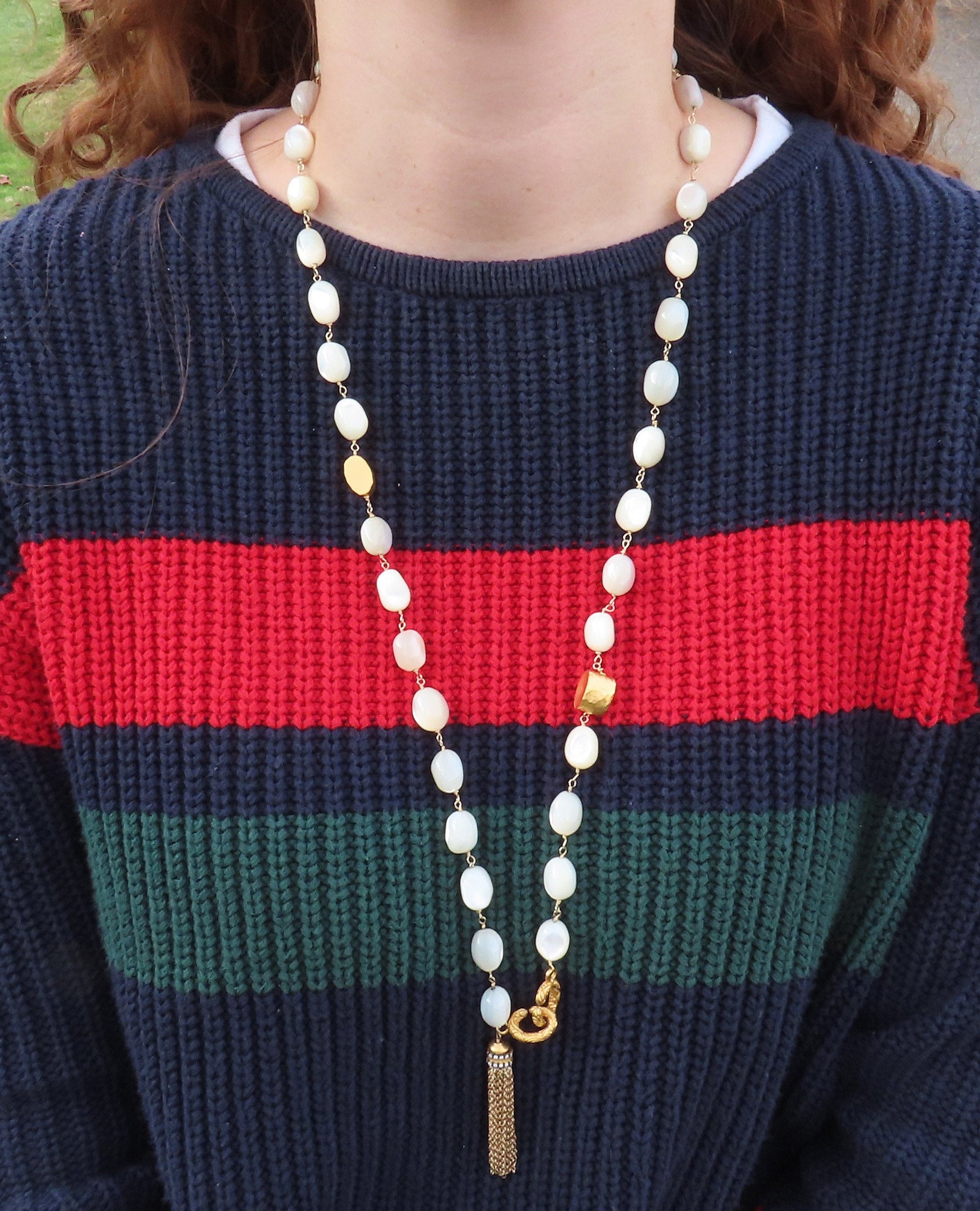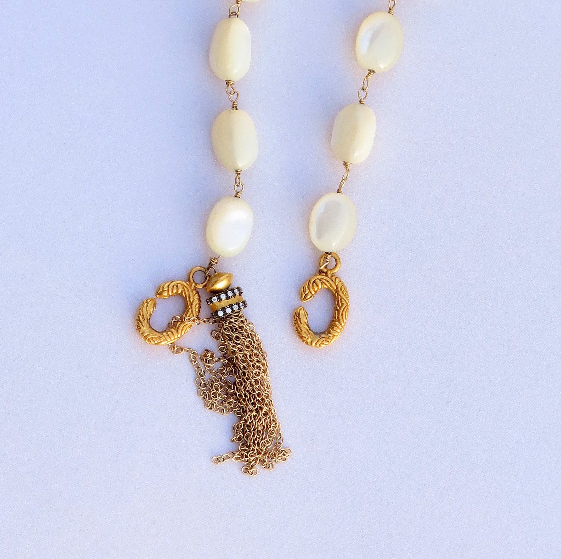 Elegant Opera Length Mother of Pearl Gilt Silver Vermeil Beaded Tassel Necklace