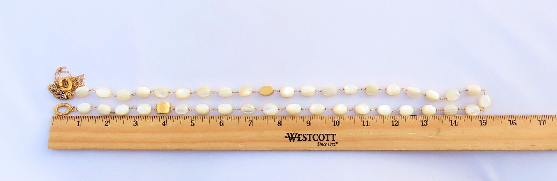 Presented is a unique mother of pearl and gilt silver beaded necklace. The necklace features oblong polished beads of beautiful mother of pearl, with hammered finish accent beads and a decorative tassel of gilt silver. The clasp is a simple but secure design consisting of two C shaped gold links that hook together.