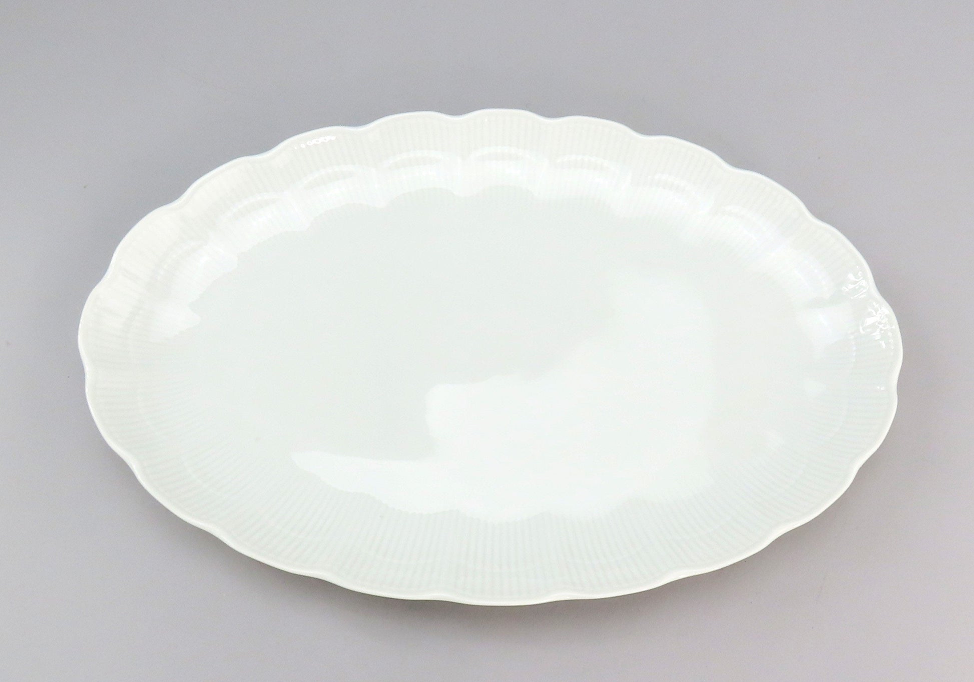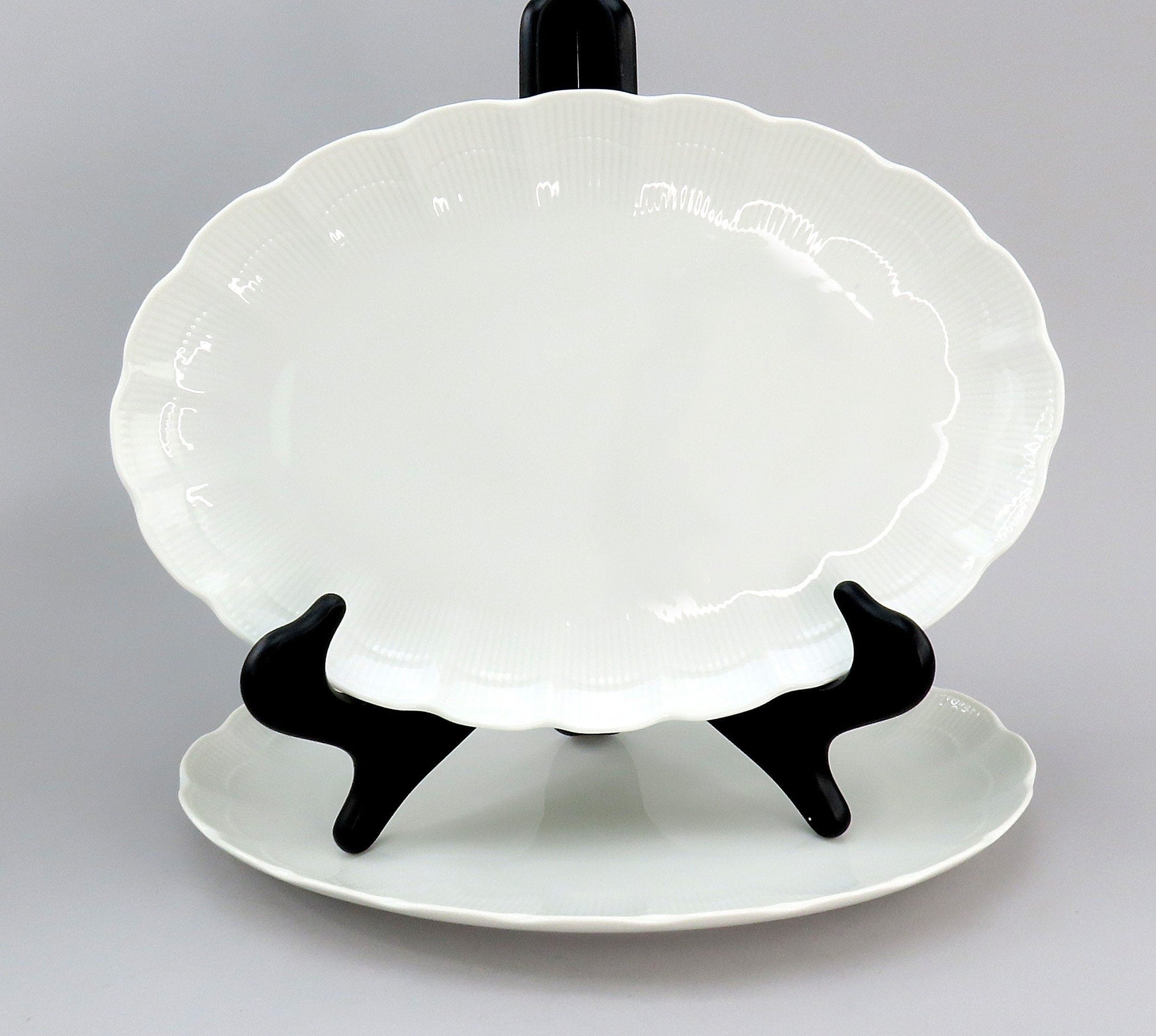 Presented is a pair of porcelain oval platters from Kaiser. This pair is in the Romantica pattern, which was produced between 1988-2004. This pattern displays a scalloped edge with subtle vertical ribbing decoration around the border.