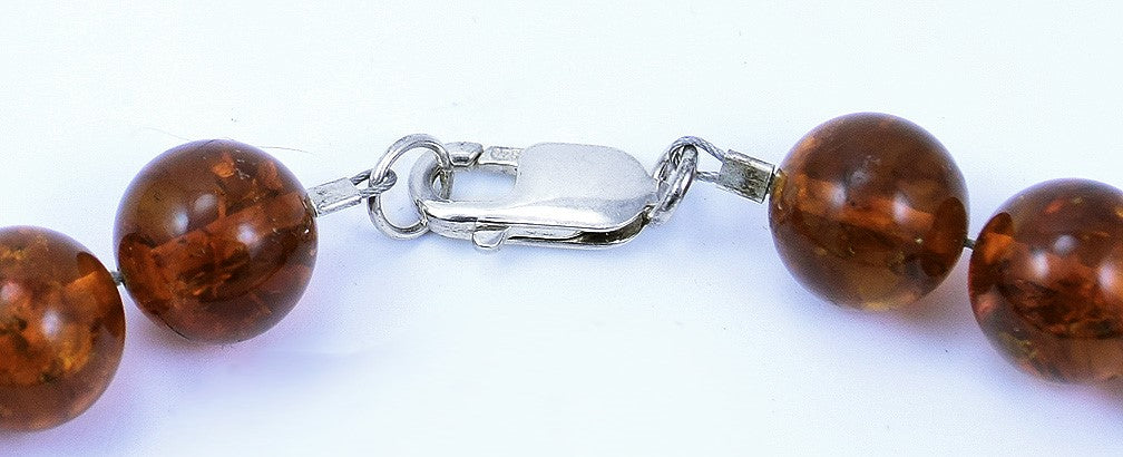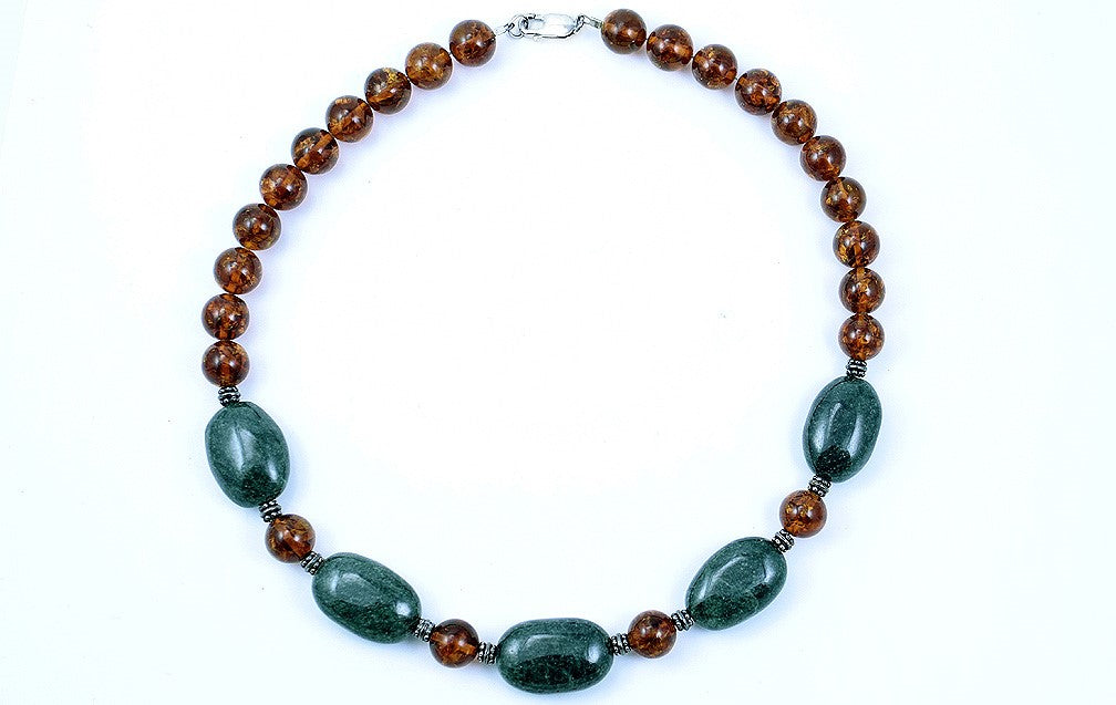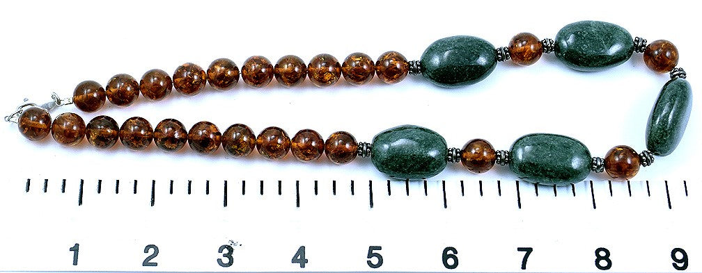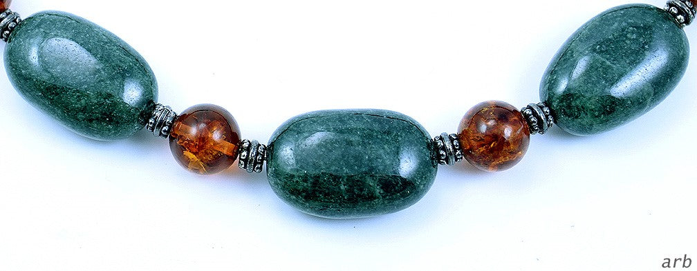 Presented is a very nice beaded necklace featuring silver, green, and amber beads. The polished green beads measure 28.63mm. The round orange beads are genuine amber. They measure 12.23mm. The silver accent beads are we believe to be sterling silver, tarnished a bit, which adds a neat character to the necklace.