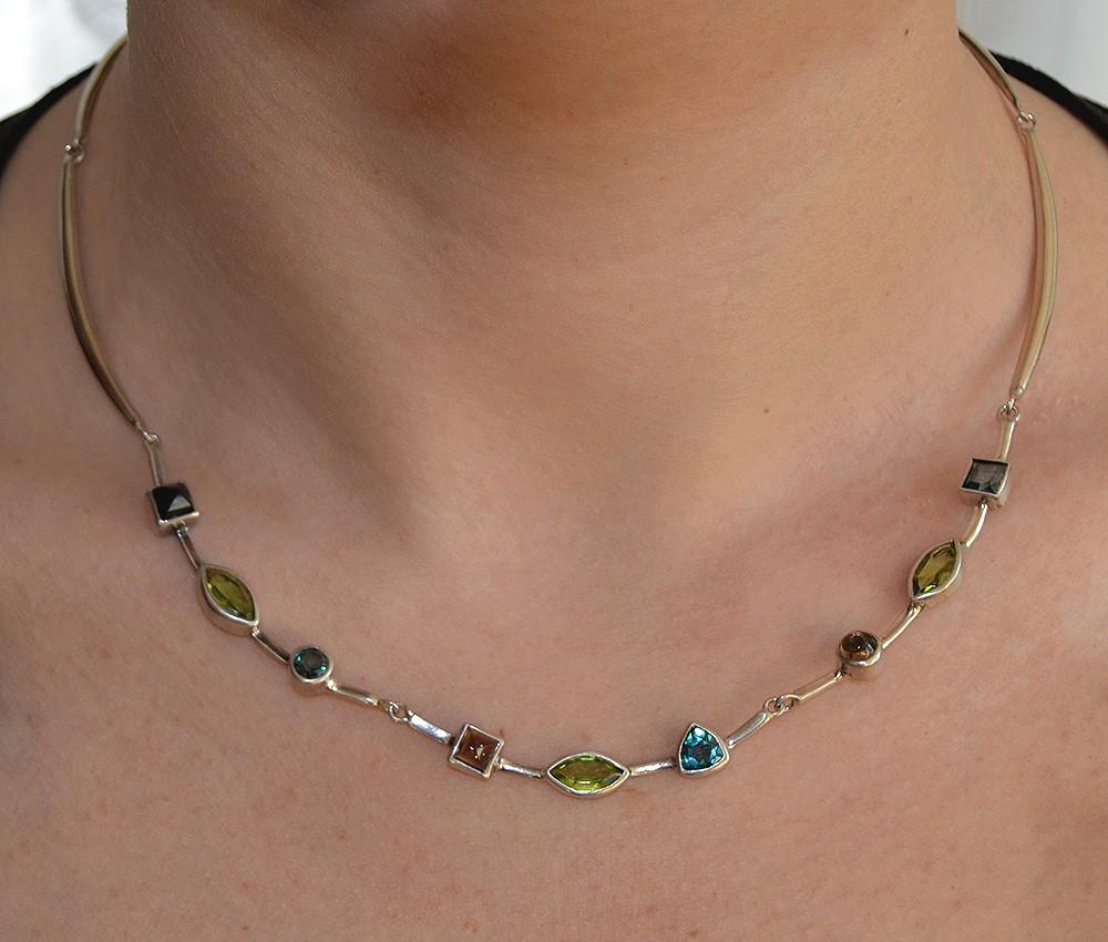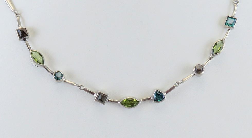 Elegant Sterling Silver Peridot Blue Topaz Smoky Quartz Geometric Necklace