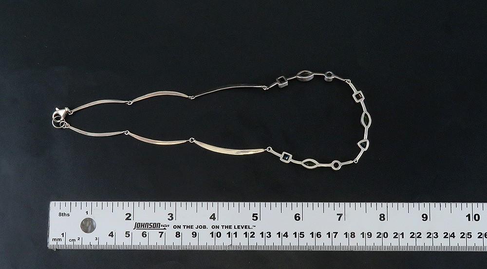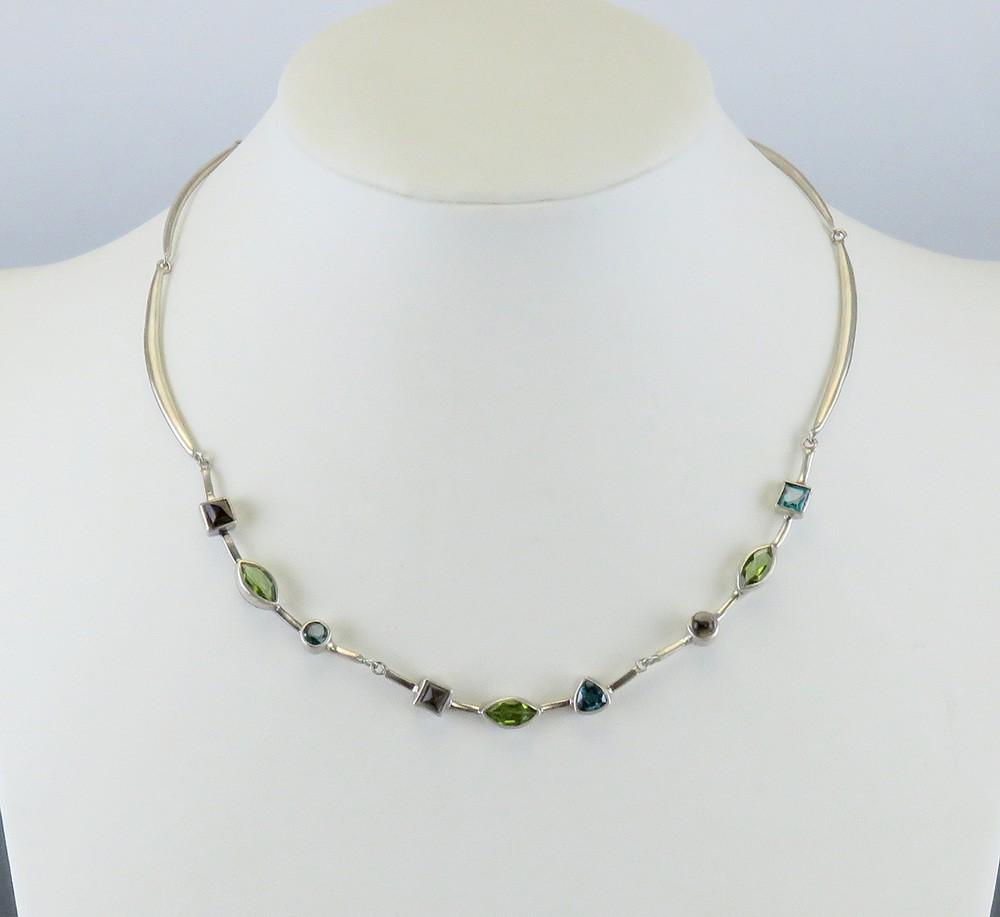Presented is a beautiful sterling silver and gemstone necklace. This is a relatively contemporary piece, likely of American make. The necklace consists of long crescent shaped links, with the three frontmost each bezel set with three gemstones. Each of the three sections is set with a smoky quartz, a peridot, and a blue topaz. The peridot stones are all marquise cuts, while the blue topaz and smoky quartz are done in varying cuts. The stones have nice vibrant color, particularly the blue topaz which I think is a very appealing shade of blue. The necklace has a lobster style clasp.