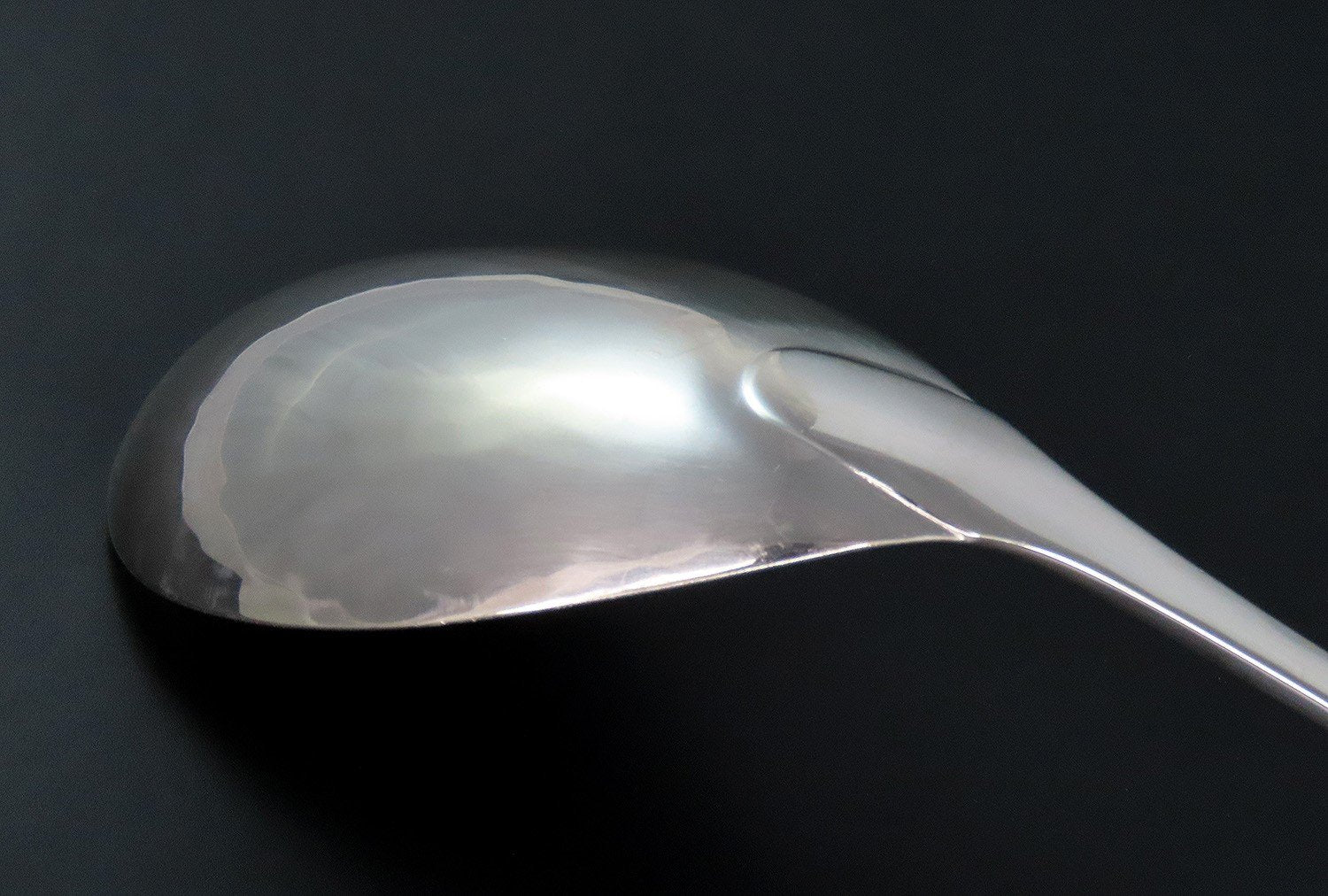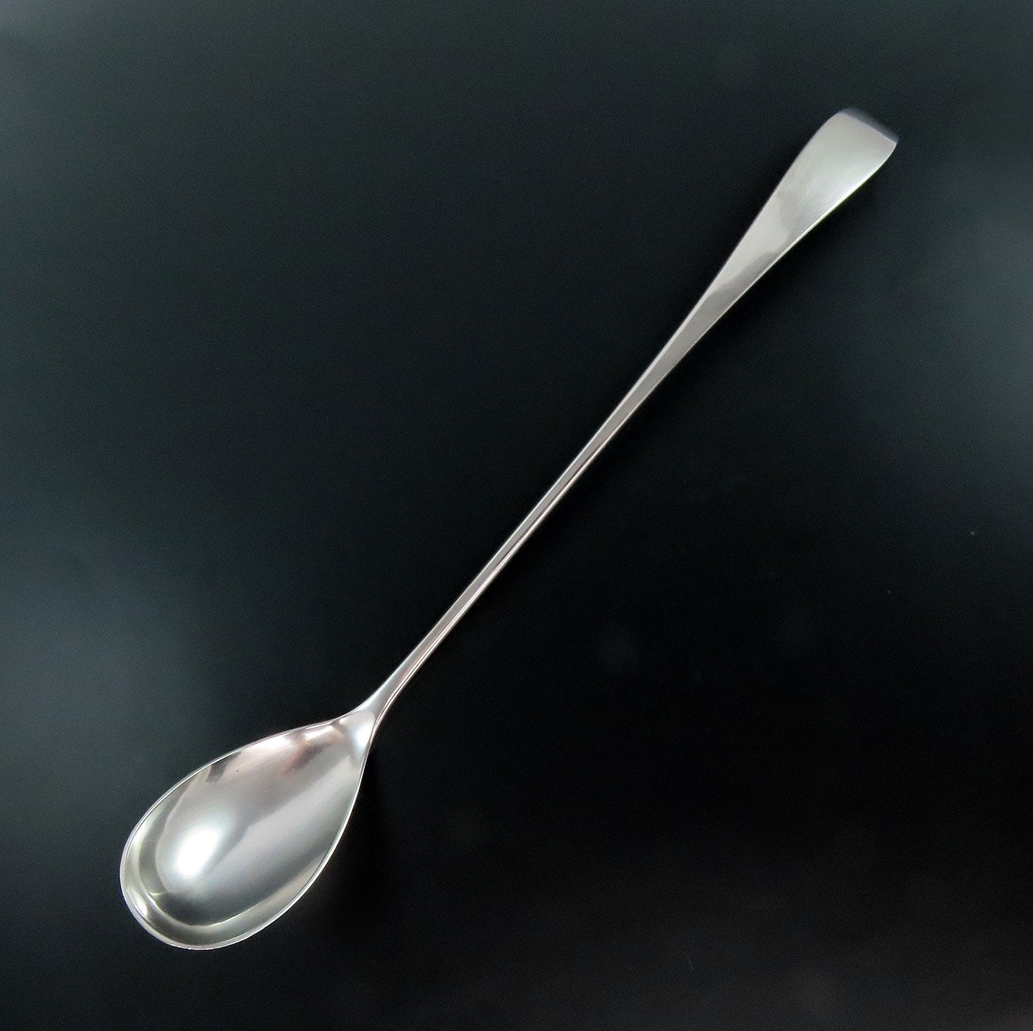 Presented is an elegant sterling silver long handle serving spoon from Arthur Stone. This piece displays a great pointed end back tipt pattern. The back of the bowl shows beautiful hand-hammered detailing. The bowl has a great long oval shape and a curved handle making the piece great as a service spoon or stirrer for a pitcher of cocktails.