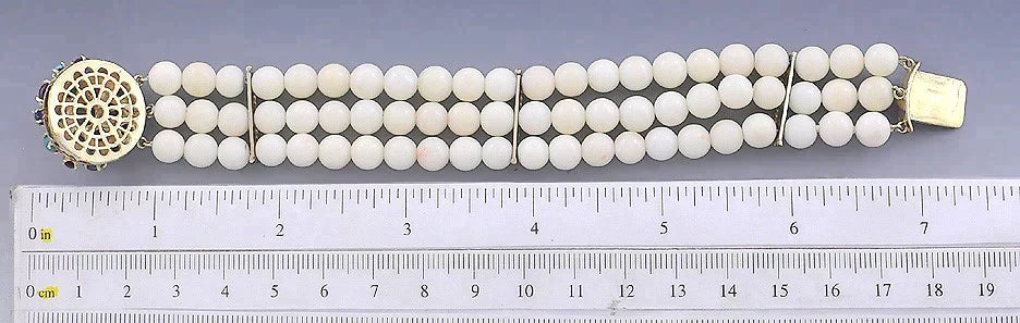 Presented is a stunning triple strand coral bead bracelet with a gem-set 14 karat gold clasp. The clasp is round, prong set with various size cabochons of ruby, sapphire, and two colors of turquoise. The coral beads are a lovely delicate pink-white shade, with slightly darker pink mottling visible here and there. The strands are yoked together with gold rope twist bar separators at three points on the bracelet's length.