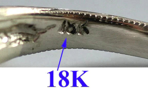 The ring is marked on the inside of the band with 18K and the engraving. We have tested the setting with nitric acid and guarantee that it is 18K gold.