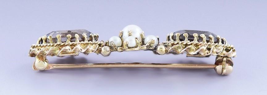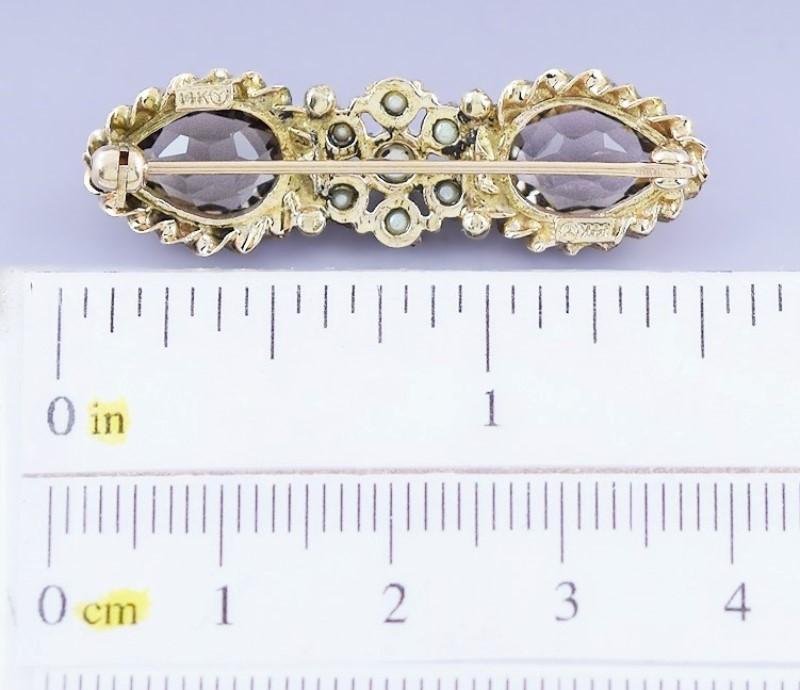 Presented is an elegant vintage 14k yellow gold, smoky quartz and seed pearl pin or brooch. This is an American piece dating to around the 1970s-1980s, though it has an antique, almost Victorian look to it. The pin is prong set with two pear cut smoky quartz gemstones, with a rosette of seed pearls between them. The brooch has a rollover style safety clasp on the back, which is quite secure.
