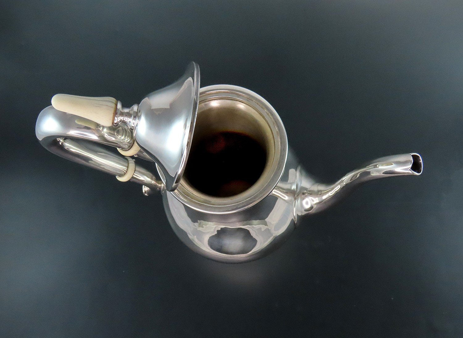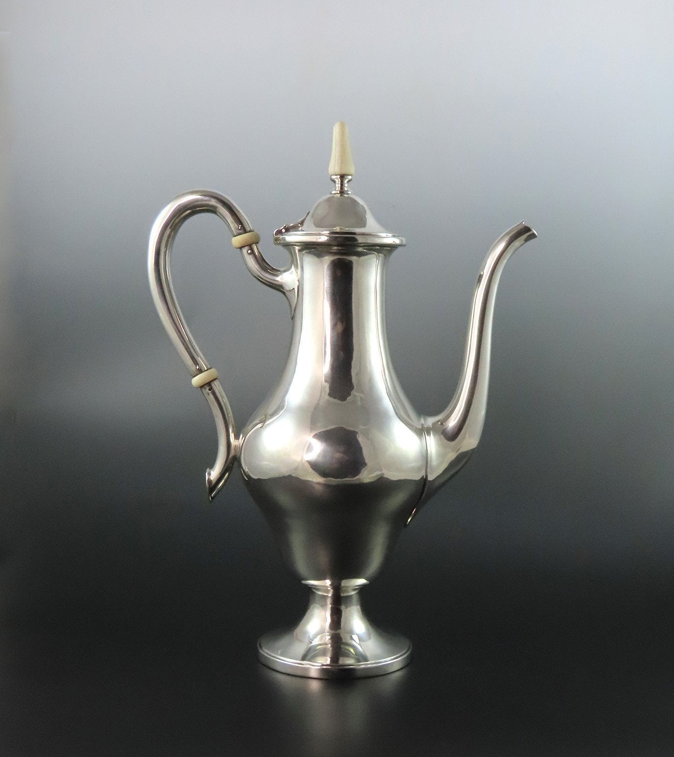 Presented is a wonderful American sterling silver tea or coffee pot by Erickson. The pot is handwrought, with the marks of hand hammering visible in the finish. The design is very graceful, with a round pedestal foot, tall, rounded form, and elegantly curved spout. The pot is extraordinarily well made, with exceptional thickness to the silver and a nice feeling of weight in the hand. This is a smaller size pot, suitable as a bachelor style teapot or demitasse pot, with a capacity of about 2 cups, or 16 fluid ounces/470 milliliters.
