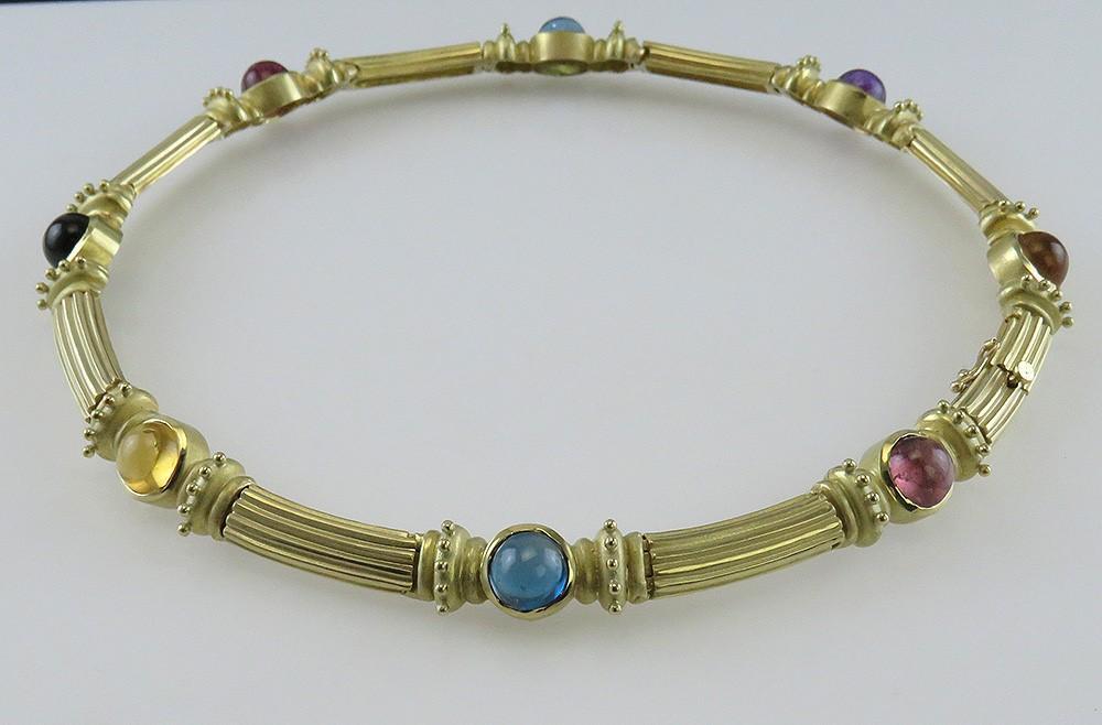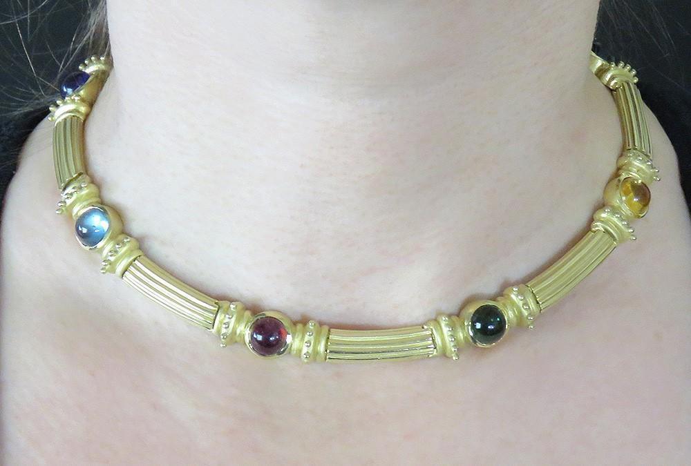 Presented is a fabulous quality, 14 karat gold and natural gemstone choker style necklace. This piece is done in an Etruscan sort of column style and the piece is securely bezel set with 8 natural gemstone cabochons. The stones include: amethyst, pin and green tourmaline, citrine and blue topaz. Each gemstone measures approximately 10 millimeters in diameter and is approximately 5.5 millimeters deep.
