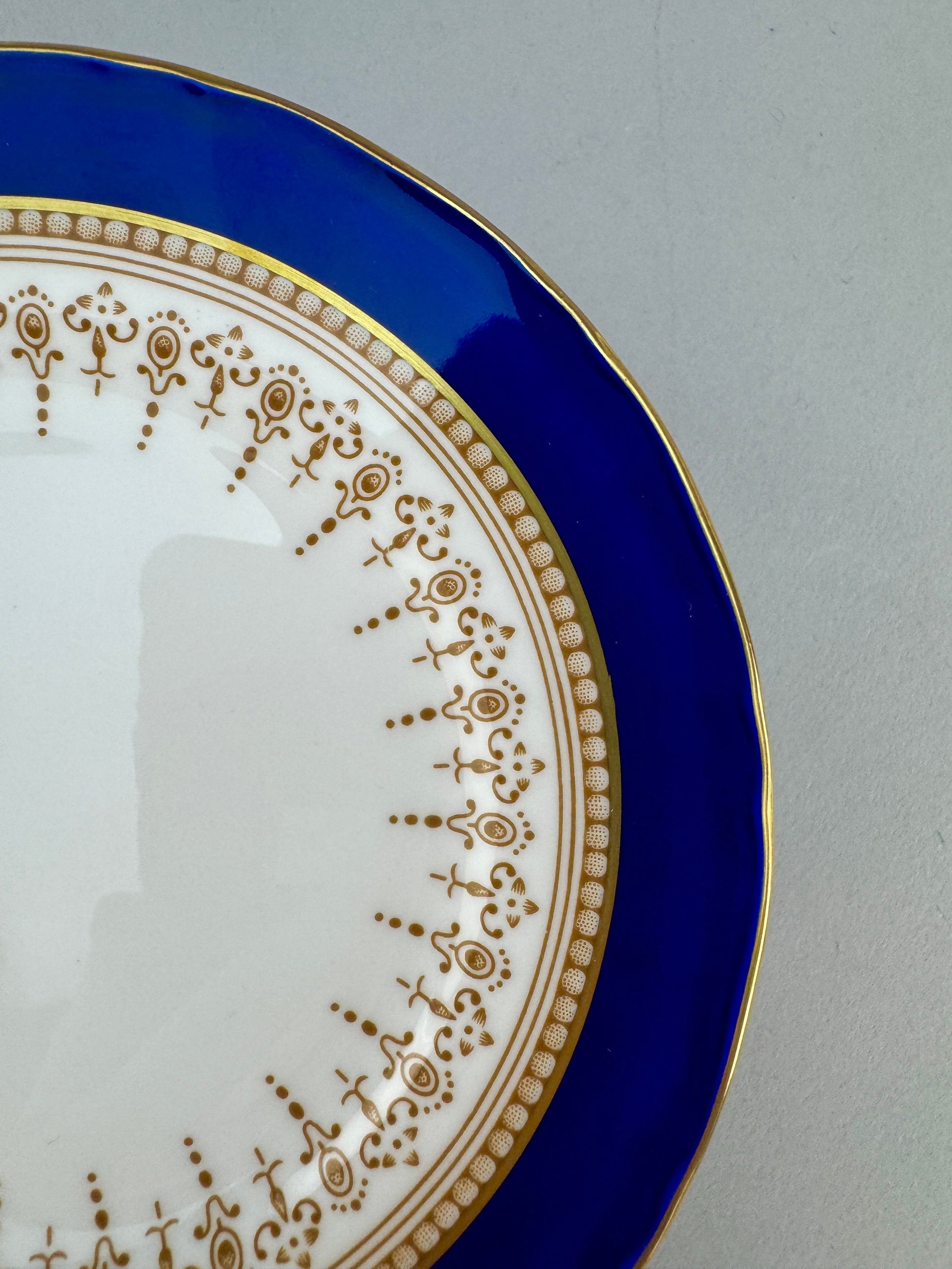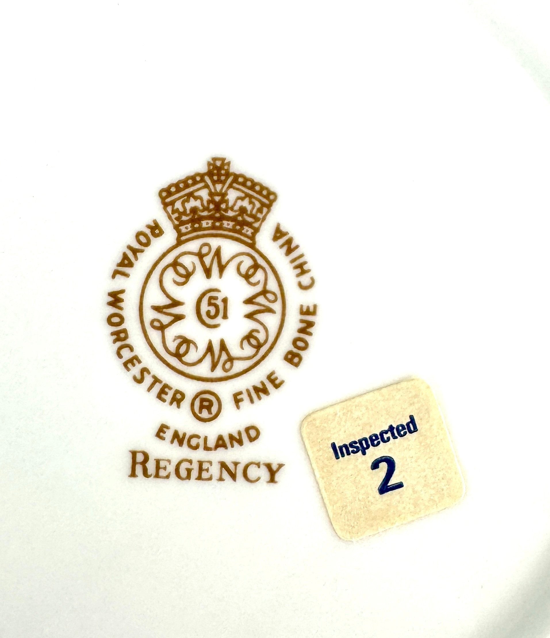 Presented is a fantastic set of 8 Royal Worcester bread and butter plates, in the Regency pattern. This is a stunning and regal pattern featuring a wide cobalt blue border with finely executed gilt decoration around the interior and rich gilt rims. Please note, we have additional sets of plates in this pattern, which can be found in our store by searching “Regency.”
