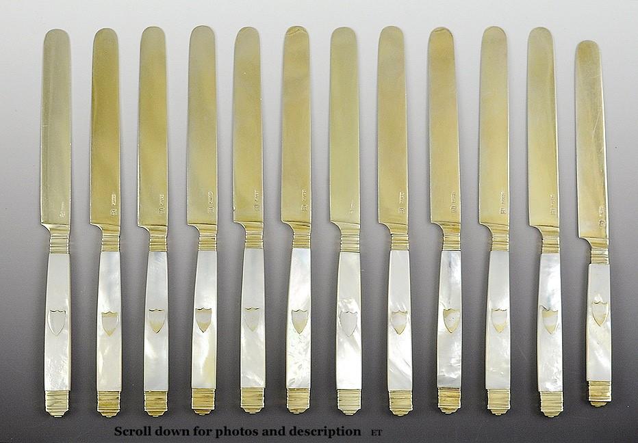 Excellent Set of 12 Mother of Pearl & Gold Washed Silver Knives