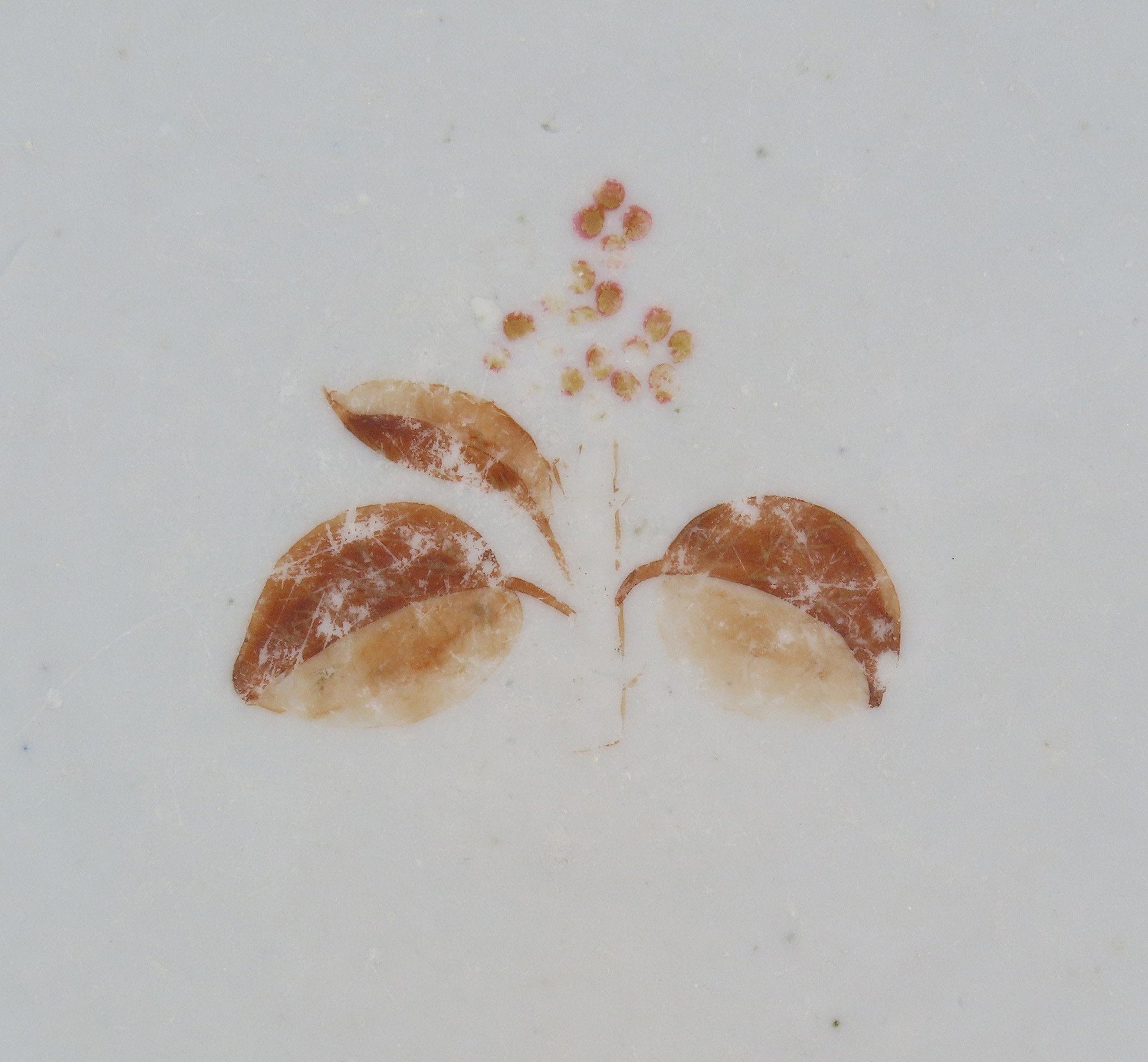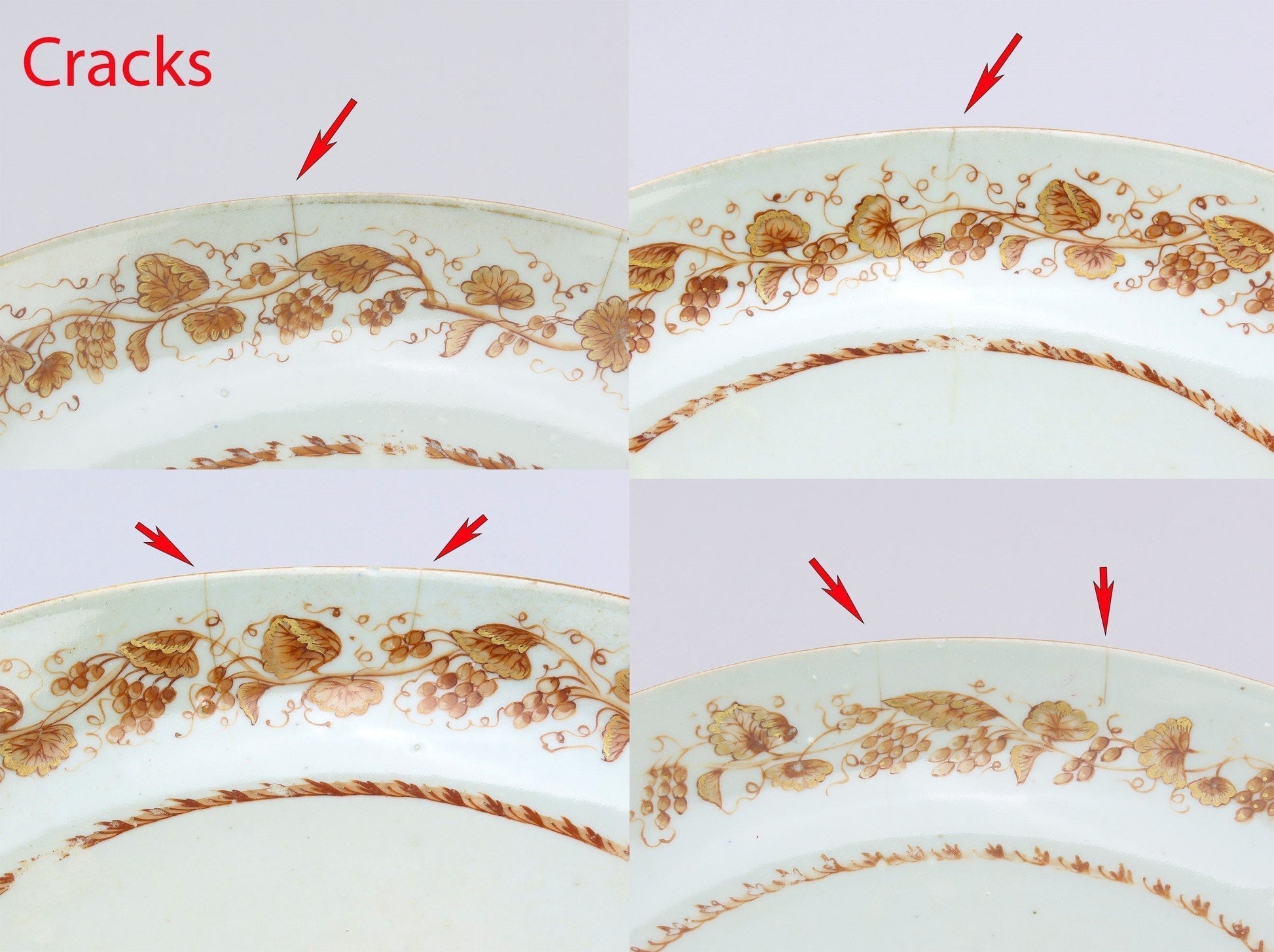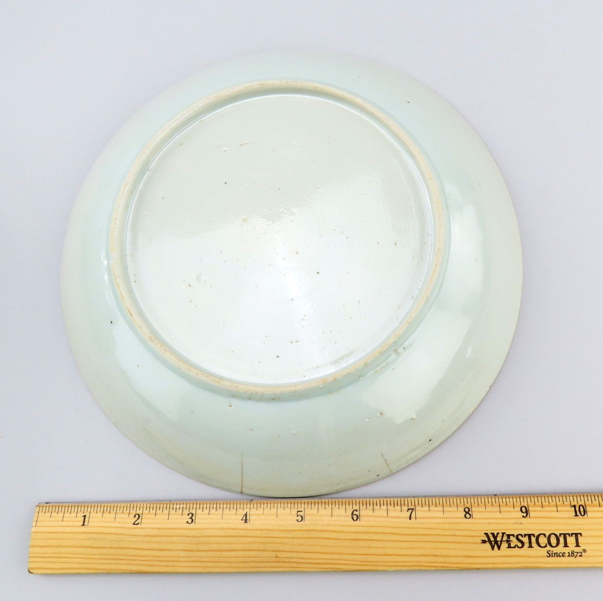 This set is in good overall condition, considering the age and material. There is some wear to the decoration, most notably the central design and the inner border, where the plates would have touched when stacked. All six of the plates have minor hairlines to the rim here and there, but only one has a hairline that extends inward beyond the footrim. A couple of the plates have minor chips. None of these issues are super noticeable, and overall the plates still have a nice ring to them when tapped.