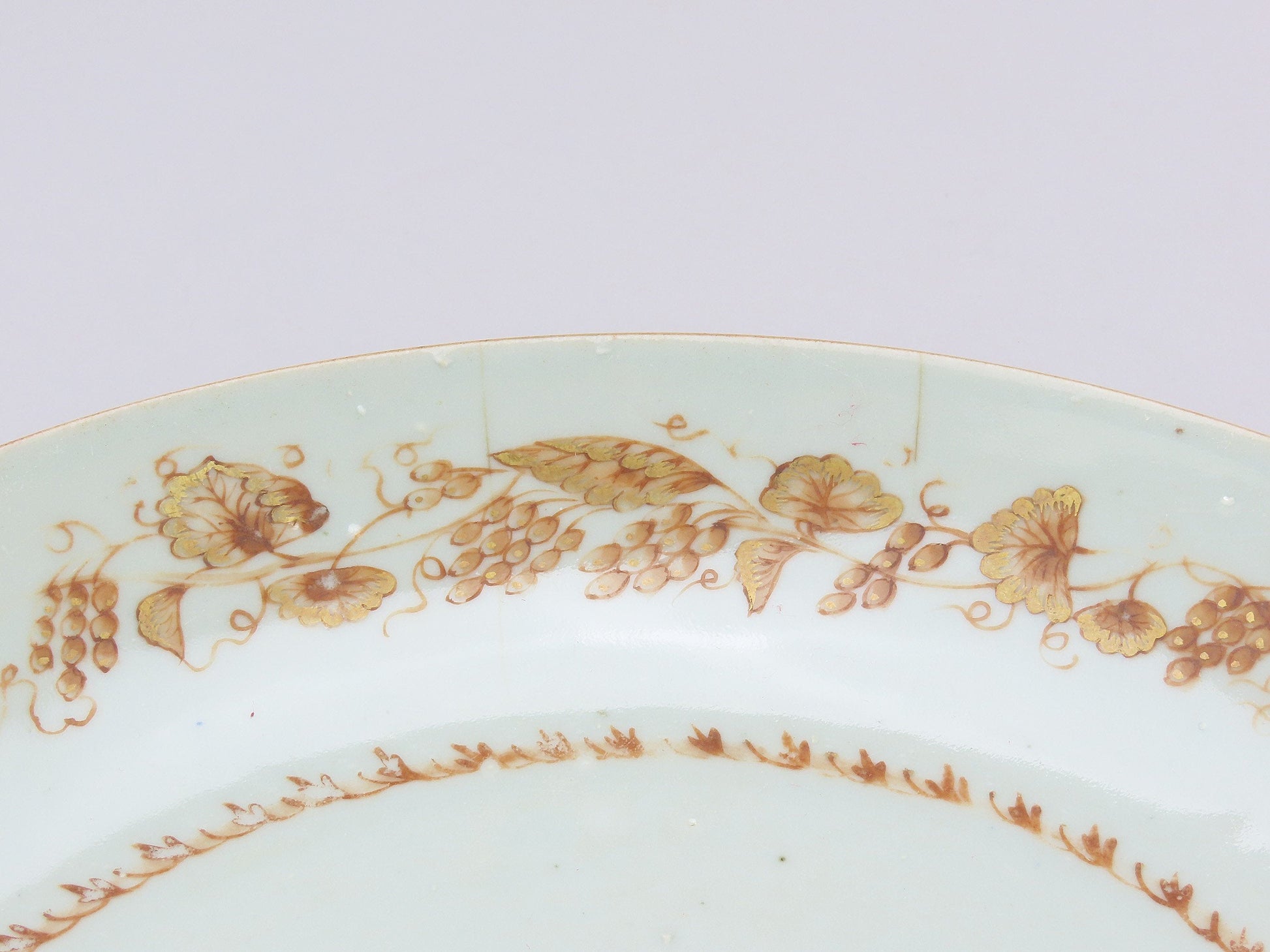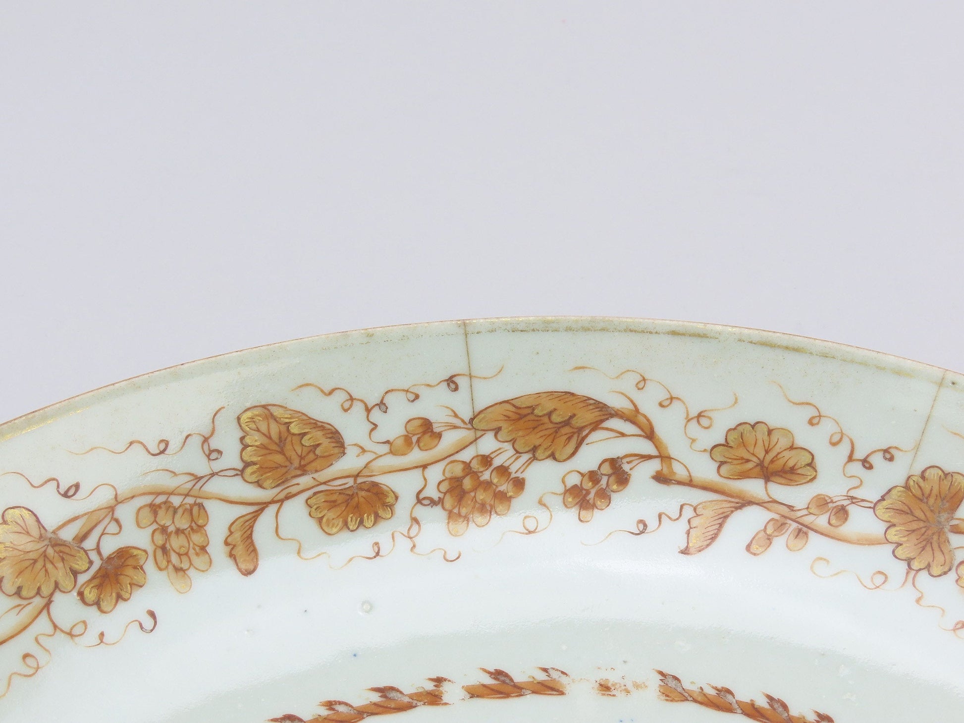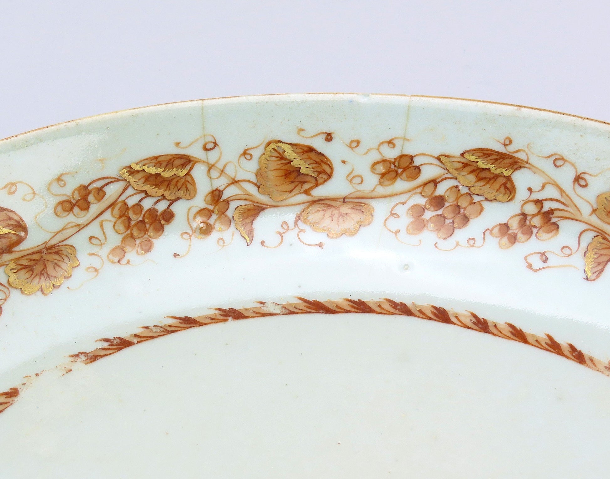 Presented is a fantastic set of 6 antique Chinese export porcelain plates, dating to circa 1770-1820. The plates are white with brown/sepia decoration around the rim, in the form of leafy grape vines with clusters of grapes and little curlicues, very nicely detailed and well done. The photos don't do the quality of the decoration justice, the leaves and even the grapes are richly hand painted, down to veining and hand gilt detailing. These plates are almost like shallow wide rim soup bowls in design, with higher, more sloped rims than are typically seen on plates, but they are closer to plates than bowls in our opinion; of course they can be used however you like.