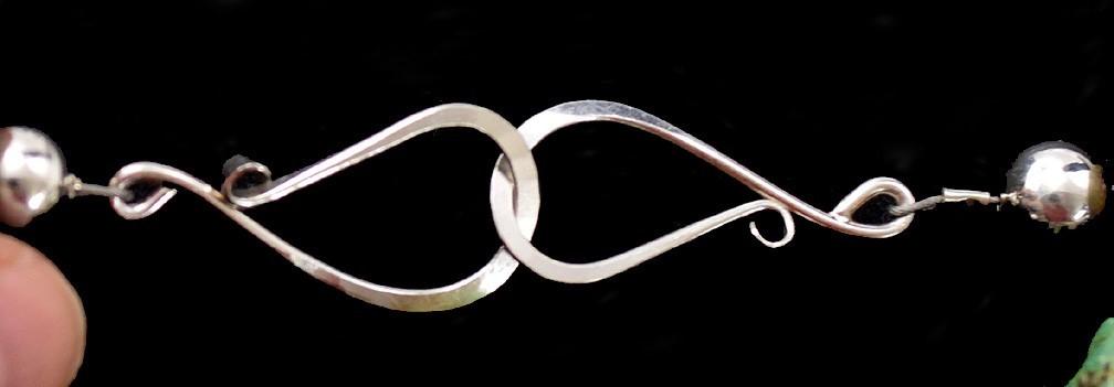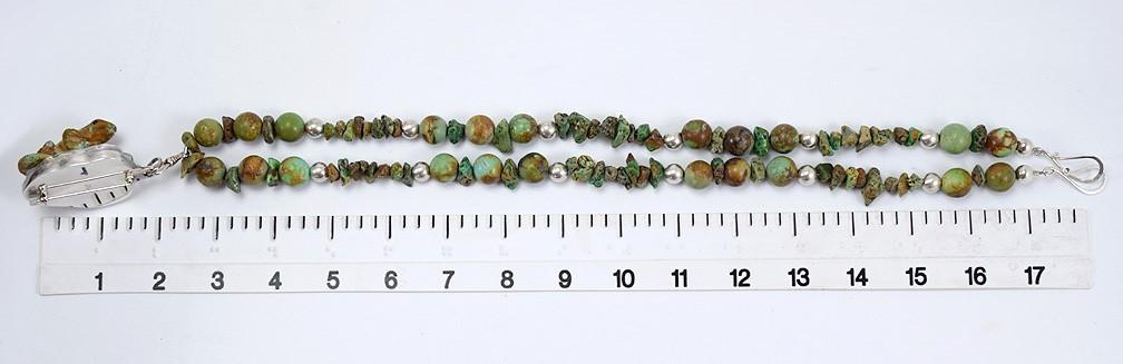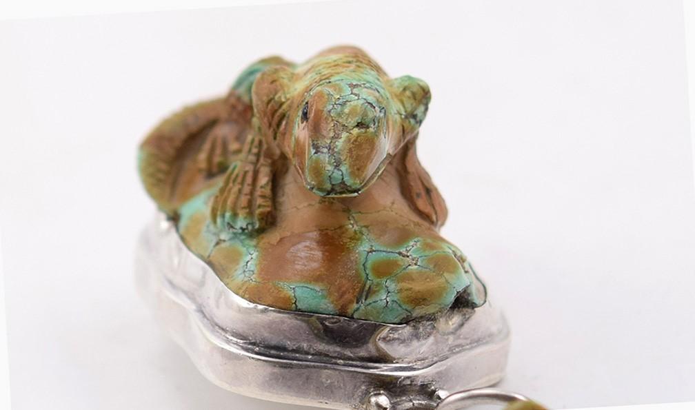 Presented is a long, unusual necklace featuring sterling silver and green turquoise beads, with a 3-dimensional pendant in the form of a lizard.