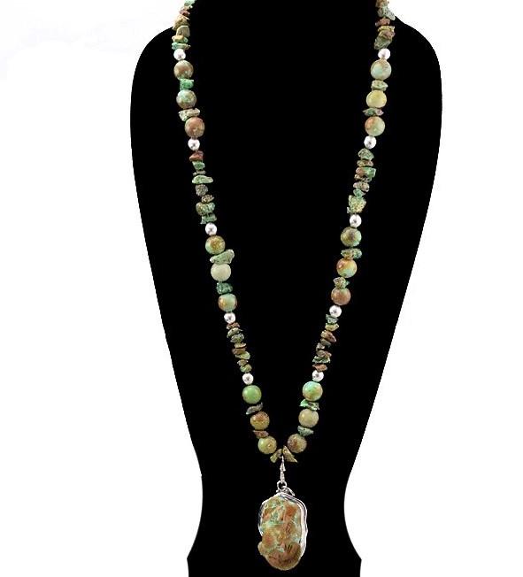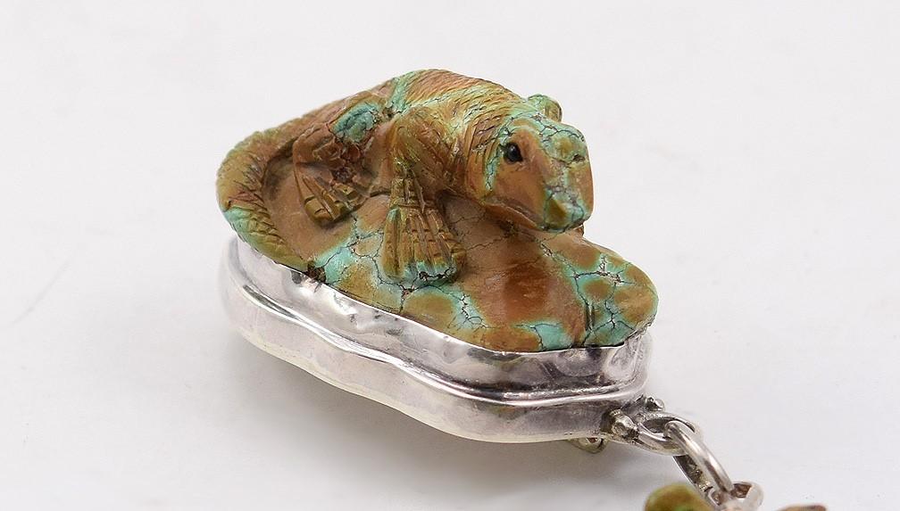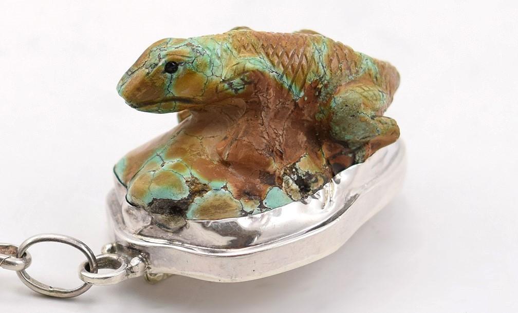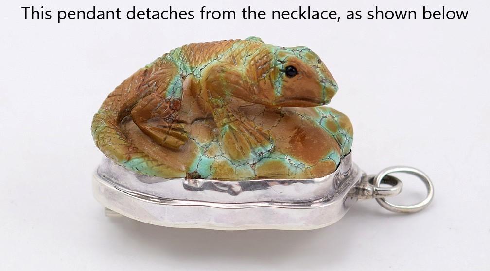 Exotic Necklace Sterling Silver and Green Turquoise w/ Green Lizard Boxy Pendant