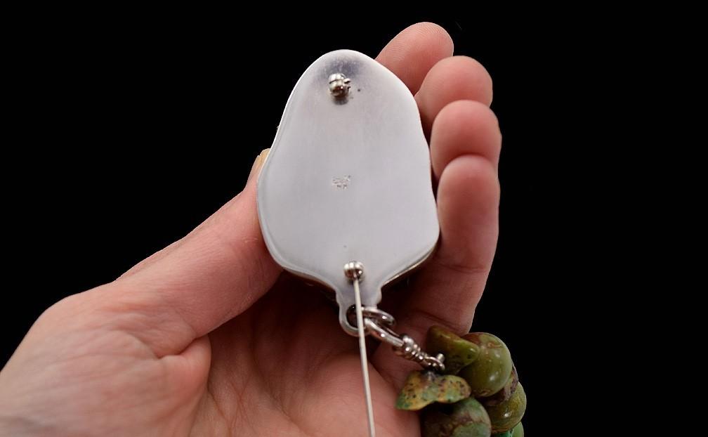 The green-brown stones are genuine turquoise.The carved lizard is also made of turquoise.The pendant has a pin back and can be used as a pin when removed from the necklace.