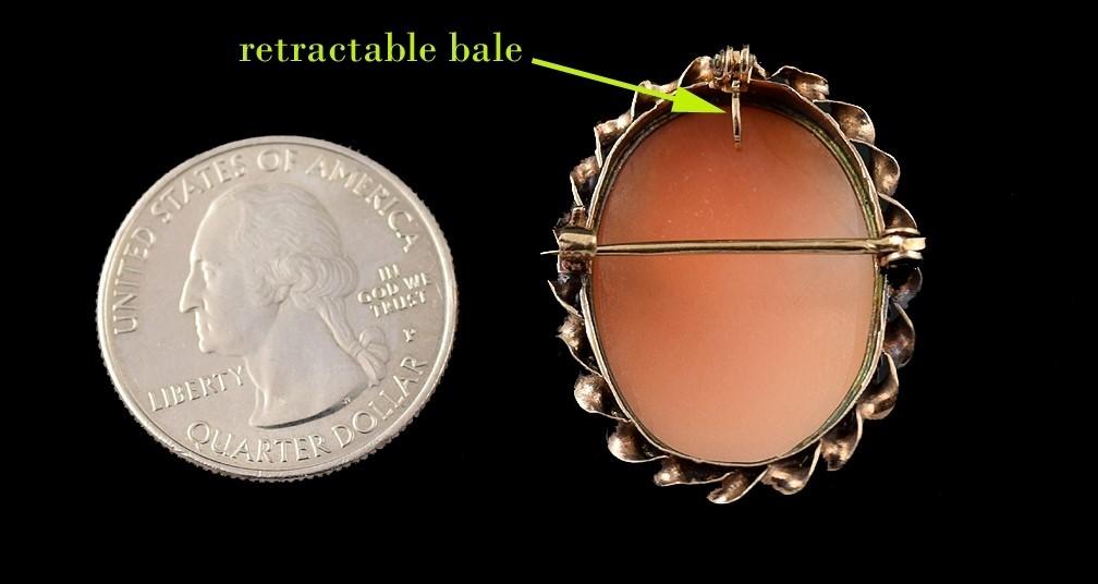 This piece features a beautifully carved profile of a young lady with a flower in her hair. The style is a bit more striking and Art Deco than some cameos. It has a lever catch style clasp as well as a retractable bail so that it may be worn as a pin or pendant.