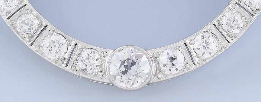 The diamonds graduate in size from the smallest at the top to thelargest at the bottom of the circle, with the smallest being about 3 points in size and the largest being about 85 points in size. The largest center diamond is significantly larger than the next largest diamonds on either side, which are about 22 points each in size. The largest diamond is an extraordinarily high quality stone, of VVS clarity and G color. Our gemologist has examined this diamond under 45x magnification and even at that level of magnification it is eye-clean. The rest of the diamonds are VS to SI clarity, and are quite dazzling