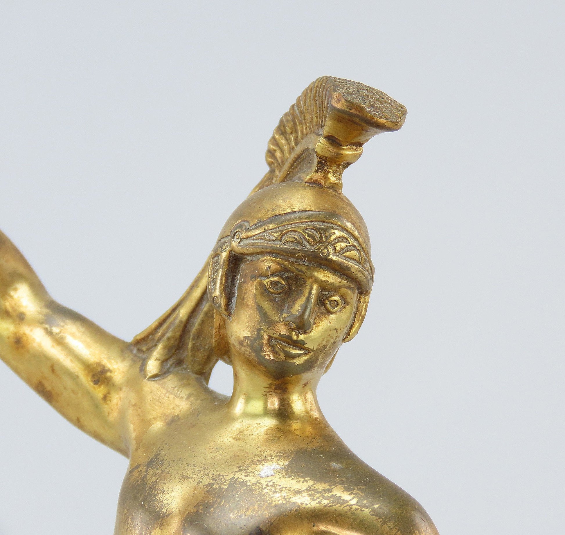 This piece is in excellent overall condition. There is some wear to the gilding, though in our opinion this gives the piece an attractive antiqued look. The underside of the stone base has a green felt cover, which has some wear and is no longer firmly attached at all points, though it could easily be removed, replaced, or reglued. There are no breaks or repairs to the bronze or the base.