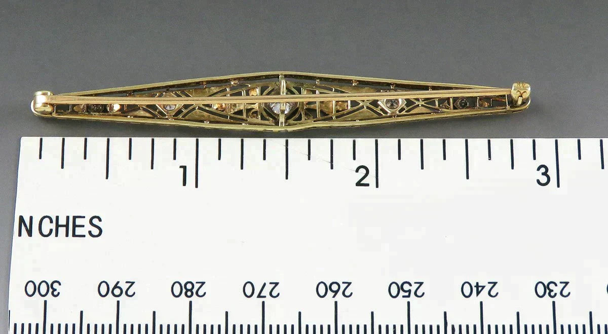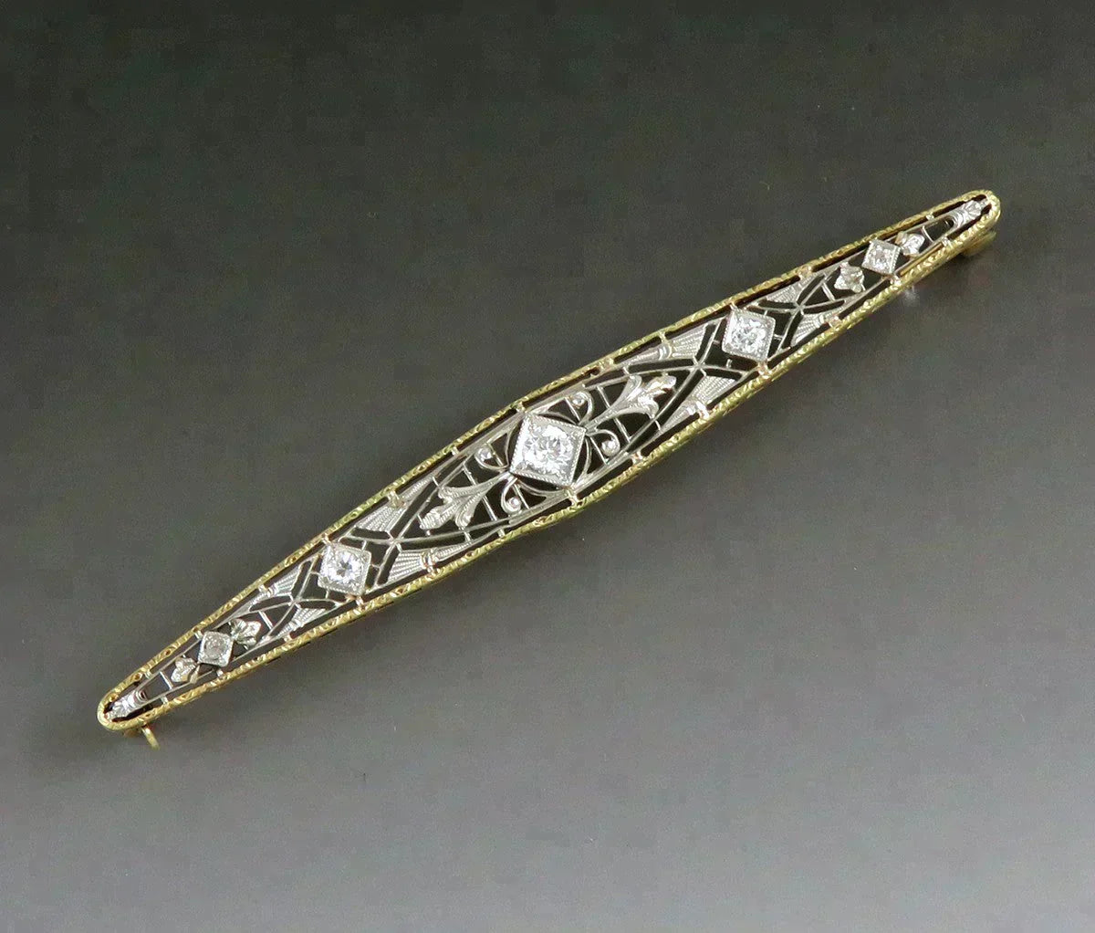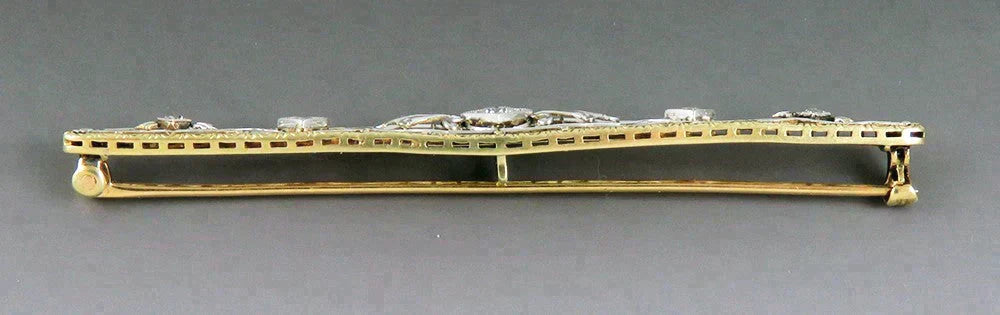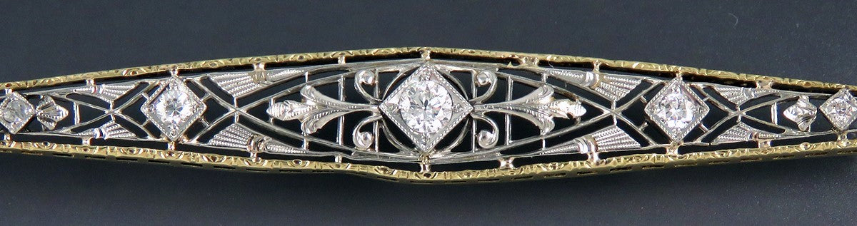 Presented is a fabulous antique 14 karat yellow and white gold and diamond bar pin. This pin was made by Krementz, a renowned jewelry maker, and dates to the first quarter of the 1900s. The pin is done in a fantastic filigree openwork design, very finely engraved and detailed. The filigree in the center of the pin is white gold, while the edges are yellow gold. The pin is set with five diamonds graduated in size towards the middle. The largest diamond, in the center, is an old mine cut stone of about 20 points in size. On either side is a diamond of about 5 points in size, and at each end of the pin is a smaller diamond about 1 point in size. The diamonds are vibrant, dazzling stones of VS-2 clarity and G/H color, totaling about 32 points in weight, or just about a third of a carat. The pin has a lever catch style clasp which is very secure.