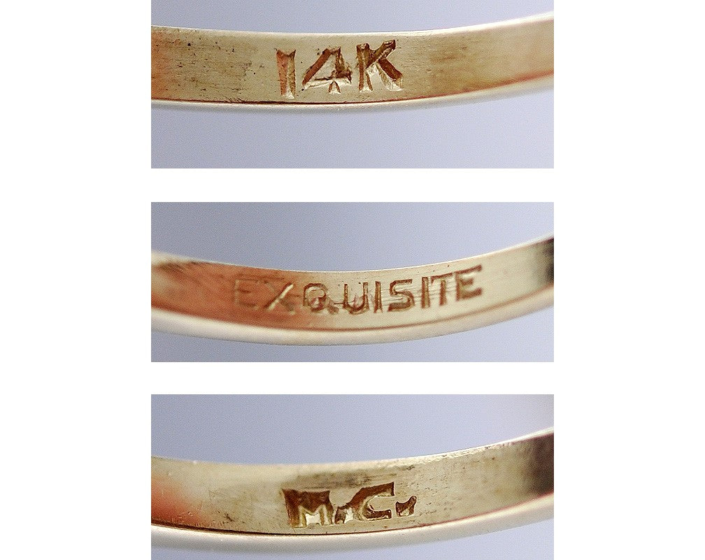 The ring is marked on the inside of the band with 14K and EXQUISITE & M.C. for the line and/or maker. We have tested it with nitric acid and guarantee it to be 14K gold.